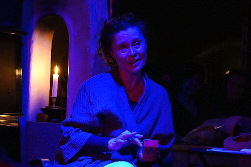 Heute Abend sind eindeutig die weiblichen Gäste in der Überzahl. Dabei ist es keineswegs nur ein „Frauen­thema“, das Elissavet Hasse den Besuchern in Form eines Monologs servieren will. Es ist der dritte Teil ihrer Trilogie Ich bin ein Gastar­bei­terkind. Und das Thema ist im weitesten Sinn Heimat. Bei Ich bin Şafak geht es um Entwick­lungs­mög­lich­keiten, Identität und Kultur. Anhand der Biografie von Şafak Pedük, Schau­spie­lerin, Tänzerin und Sängerin aus Köln, erzählt Hasse von den verschie­denen Aspekten, die das Leben in zwei verschie­denen Heimat­ländern ausmachen. Dazu hat Hasse eine kleine Bühne, eher ein Podium, in einer Ecke des Lokals aufgebaut. Darauf ist Platz für einen Stuhl und drei Beistell­tische. Für die Beleuchtung wählt sie sehr deutliche Farben. Ein Schein­werfer taucht das Podium in unvor­teil­haftes, ja, gespens­ti­sches Blau, der Eingangs­be­reich ist ganz in Rot eingefärbt.