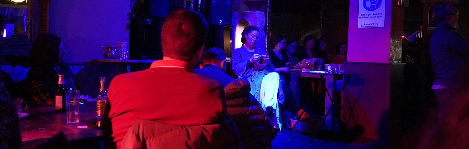 Heute Abend sind eindeutig die weiblichen Gäste in der Überzahl. Dabei ist es keineswegs nur ein „Frauen­thema“, das Elissavet Hasse den Besuchern in Form eines Monologs servieren will. Es ist der dritte Teil ihrer Trilogie Ich bin ein Gastar­bei­terkind. Und das Thema ist im weitesten Sinn Heimat. Bei Ich bin Şafak geht es um Entwick­lungs­mög­lich­keiten, Identität und Kultur. Anhand der Biografie von Şafak Pedük, Schau­spie­lerin, Tänzerin und Sängerin aus Köln, erzählt Hasse von den verschie­denen Aspekten, die das Leben in zwei verschie­denen Heimat­ländern ausmachen. Dazu hat Hasse eine kleine Bühne, eher ein Podium, in einer Ecke des Lokals aufgebaut. Darauf ist Platz für einen Stuhl und drei Beistell­tische. Für die Beleuchtung wählt sie sehr deutliche Farben. Ein Schein­werfer taucht das Podium in unvor­teil­haftes, ja, gespens­ti­sches Blau, der Eingangs­be­reich ist ganz in Rot eingefärbt.
