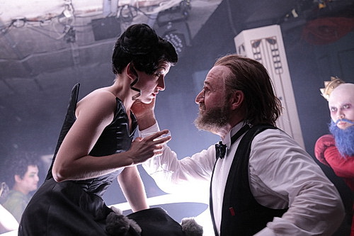 Der Spielort ist bezeichnend für das Desaster: Die Außen­spiel­stätte an der ewigen, wohl noch mindestens bis 2024 andau­ernden Baustelle des Opern­hauses am Offen­bach­platz. Ein langer, enger Schlauch, in deren Mitte eine runde, von Dieter Richter gestaltete Bartheke als Bühne reichen muss. Sechs Musiker, teilweise aus den Reihen des Gürzenich-Orchesters mit Gerrit Priessnit am Klavier an der Spitze, agieren außen, den Blicken der Zuschauer entzogen. Das erinnert eher an Kneipen-Theater als an eine ehren­volle Würdigung des großen Musik­dra­ma­tikers. Regisseur Christian von Götz zimmerte eine banale Rahmen­handlung um den Kellner Jakob zusammen, der seine Kneipe endlich schließen will. Doch nach und nach erscheinen bekannte und weniger bekannte Figuren aus Offen­bachs Stücken, die den Meister sehen wollen. Und als der entpuppt sich am Ende Jakob, der Kellner.