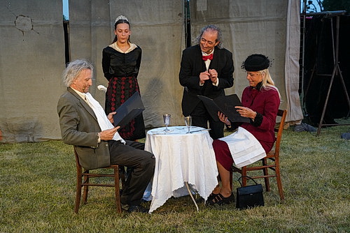 Mit einem wahren Feuerwerk an Einfällen ziehen die Schau­spieler das Publikum immer gerade so weit in ihren Bann, dass den Besuchern noch genügend Platz für die eigene Fantasie bleibt. Und da darf man all das, was einen ins Theater treibt: Ein wenig träumen, melan­cho­lisch werden, Hoffnung schöpfen und mal leise lächeln, aber oft auch herzlich lachen. Zum Beispiel, wenn Andreas‘ Ex beim gemein­samen Dinner lakonisch feststellt: „Jetzt regnet es“. Längst schon hat sich da der Himmel verfinstert, weht eine frische Brise über den Platz, als der erwartete Regen kommt. Der entpuppt sich aller­dings statt des angekün­digten Gewitters als Wolken­bruch, dem die Schau­spiel­truppe gelassen begegnet. Für einen Moment wird das herrliche Spiel unter­brochen, die Zuschauer flüchten unter ein Zeltdach, während das Ensemble alles in Sicherheit bringt, was nicht nass werden darf. Nach dieser kleinen natur­ro­man­ti­schen Einlage, die ja irgendwie zu einer Sommer­ver­an­staltung unter freiem Himmel dazugehört, geht es erfrischt wieder ans Werk.