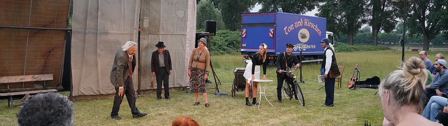 Jens Kuklik ist überglücklich, fast schon eupho­risch. Ohne es zu wissen, hat er zu seinem Open-Air-Programm auf den Poller Wiesen Seelen­ver­wandte einge­laden. Zwei Stunden vor der Aufführung der Anruf. „Jens, bist Du mutig?“ Seine Antwort eindeutig wie einsilbig. „Mutig.“ Die Medien werden nicht müde, Gewitter und Stark­regen im Rheinland für den Abend anzukün­digen. Kuklik, Künst­le­ri­scher Leiter von Atelier mobile – Travellin‘ Theatre, ist das Wetter leidlich egal. Diese Aufführung muss statt­finden! Am Morgen hat er noch nach Anwei­sungen des Gasten­sembles ein Stück Rasen mähen lassen, damit dort die Aufführung statt­finden kann. Mit der vorhan­denen Bühne ist die Truppe unzufrieden, weil das Licht an der gewünschten Stelle besser sei. Und überhaupt braucht das Ton und Kirschen Wander­theater keine Bühne. Das Ensemble ist seit 30 Jahren autark. Die Darsteller instal­lieren ihre mitge­brachte Bühne und Tribüne nach eigenen Angaben „auf histo­ri­schen Plätzen, aber auch mitten im Dorf oder sogar auf Äckern“.