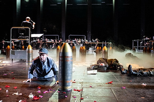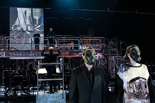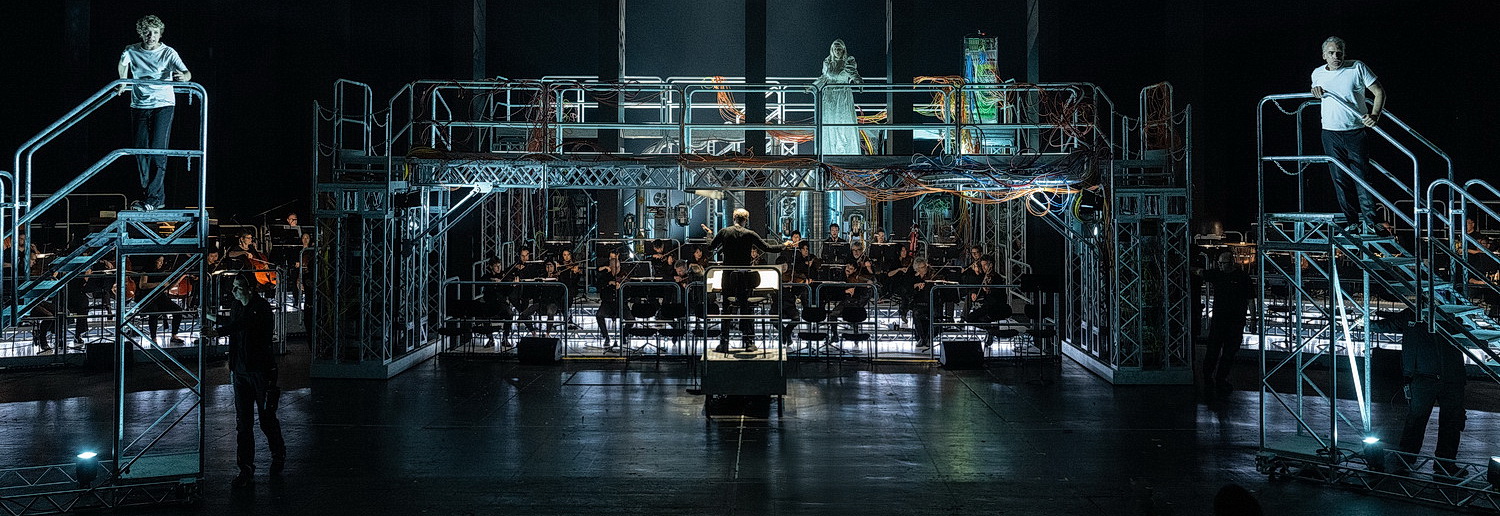 Der sinfo­nische Orches­ter­ap­parat, einge­schlossen Klavier, Akkordeon und Keyboards, ist auf der gesamten Bühne in drei Aktions­zentren positio­niert. In den Zwischen­räumen wird allerlei Gestänge aufge­fahren, mit dem Darsteller herein und hinaus gerollt werden. Ergänzt wird er um weitere Orchester mit mächtigem Blech im Rücken des Publikums sowie um die Elektronik. Der Chor betritt in einigen Phasen die Bühne von den oberen Parkett­rängen aus. Peter Rundel, der musika­lische „Oberbe­fehls­haber“ über das „Heer“ an Musikern und Sängern, gelingt es souverän, die vielfäl­tigen Forma­tionen zusammen zu halten. So entsteht ein elektro­nisch akzen­tu­iertes Klangbild, das in seinen inner­lichen Farben emotional packt, aber in seinen bombas­ti­schen Erschei­nungen stresst.