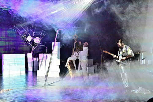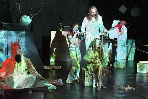 Spätestens, wenn Wagner sich von der Leibwache der Königin einwickeln lässt, entwickelt sich auch die Musik rasanter in Richtung Untergang. Herausragend dabei die Musik von Salvatore Sciarrino und Sofia Gubaidulina. Als Bühnenmusiker greift József Iszlai zunächst zur akustischen, später zur elektrischen Gitarre. Tatsächlich lenkt das aber von seiner eigentlichen Leistung eher ab. Ist er es doch, der die Klangwelten des Stücks miteinander verbunden und komponiert hat. Wenn er nicht gerade für das F.A.C.E. Ensemble arbeitet, verdient er sein Geld als Komponist für Film und Theater, der sich intensiv mit der Beeinflussung von Menschen durch Klang auseinandersetzt.