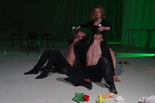 Und mit Hauke Martens und Angelo d’Aiello hat Jiménez zwei Tänzer gefunden, die sich grandios aus den Tiefen Freud­scher Psycho­logie bis hin zur kraft­mei­ernden Position empor­ar­beiten, ehe sie in Selbst­mitleid, ‑hass und ‑abschirmung versinken. Trotzdem ginge es nicht ohne Daniela Riebesam, die schon in Exxpe­riment begeis­terte, hier aber noch mal ihre Leistung beachtlich steigert. Über das verstei­nerte Objekt in den Händen der Männer, der sport­lichen Heroine des Zeitgeistes bis zur anmutigen Liebes­tän­zerin zeigt sie das ganze Spektrum in Vollendung. Gratu­lation einer Tänzerin, die in den Händen ihrer Choreo­grafin zu einem Höhenflug ansetzt und formvoll­endet landet.