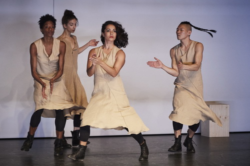 Dem Prinzip der Polyrhythmik widmet sich das Stück Mode of Walking. Hierzu hat der Choreograf „kompo­si­to­rische Vorstudien“ von Lorenzo Bianchi Hoesch anfer­tigen lassen. Die klingen auch vor dem eigent­lichen Auftritt an, wenn ein Pult mit Notebook aufgebaut wird. Das Ganze ist reichlich mystisch, kaum nachvoll­ziehbar und scheint auch wenig notwendig. Denn der Auftritt des Quartetts in „Sackleinen“ und Stiefe­letten ist spekta­kulär genug. Nicht nur, dass die Musik von den Körpern der Tänzer erzeugt wird, bringt auch die Polyrhythmik eine Wirkung, die das Publikum in ihren Bann zieht. Im Mittel­punkt stehen auch hier wieder Claudia Ortiz Arraiza und Margarida Neto. Hinzu gesellt sich Courtney Henry, die mit einem überflüs­sigen und nichts­sa­genden Solo abschließt. Betrachtet man die beiden anderen Stücke, scheint es so zu sein, dass Erstauf­füh­rungen Siegals einer Überar­beitung bedürfen, also lediglich einen Zwischen­stand zeigen, ehe sie ihre ganze Überzeu­gungs­kraft entfalten.