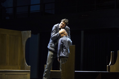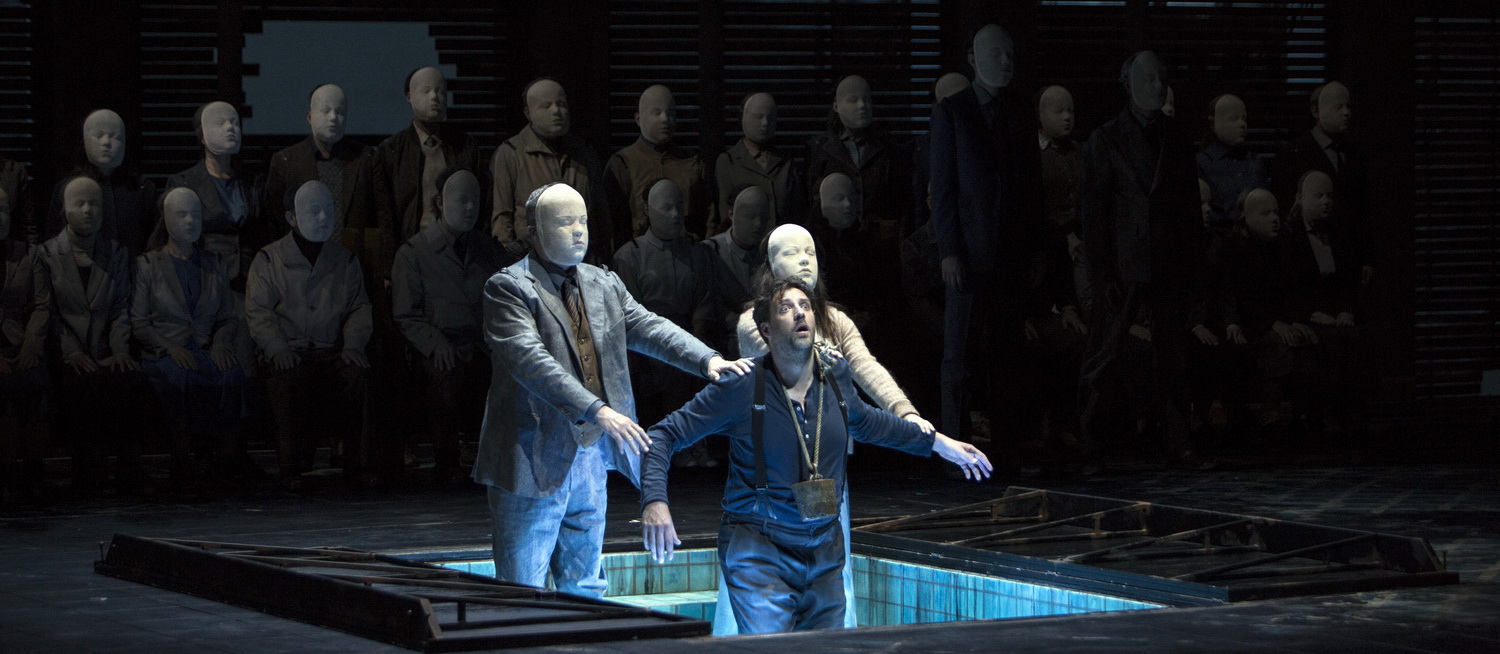 Dazu gehört mit Sicherheit die Kölner Neuproduktion, die sowohl szenisch als auch musikalisch zu den besten Beiträgen der letzten Jahre zu zählen ist. Regisseur Frederic Wake-Walker ist in dem Fischerdorf Aldebourgh aufgewachsen, aus dem der Dichter George Crabbe stammt, auf den das Libretto zurückgeht, und in dem Benjamin Britten den größten Teil seines Lebens verbracht hat. Dennoch verzichtet der Regisseur, sich zu stark an diesem mit dem Werk so eng verbundenen Dorfszenario zu orientieren. Bühnen- und Kostümbildnerin Anna Jones lässt auf der oft leeren oder nur spärlich bestückten Bühne den Chören große Freiräume und begnügt sich mit den Umrissen einer schon arg verfallenen Methodistenkirche. Die Bänke werden geschickt genutzt, um die Szene in eine Schänke oder in die Wohnstube des Titelhelden zu verwandeln. Am Ende, wenn sich der verzweifelte Grimes im Meer versenkt, steigt er in eine blau ausgeleuchtete Kellerluke wie in eine bizarre Gruft hinab. Beäugt von den Dorfbewohnern, die mit ihren einheitlich weißen Masken jede individuelle, sprich christliche Regung verloren zu haben scheinen und zu einem Mob der Gewalt zusammengeschmolzen sind. Ein mit knappen, aber präzisen Mitteln ausgerichtetes Szenario, dem die außergewöhnlich genaue Charakterisierung der vielen Figuren entspricht. Grimes, der ehrgeizige Fischer, in dessen hartem Dienst zwei Jungen ums Leben kommen, zeichnet Wake-Walker als Täter und Opfer zugleich, wobei die von der Dorfgemeinschaft ausgehende Gewalt noch drastischer zum Ausdruck kommt als die des Außenseiters. Selten geht von der vorbildlichen Chorführung eine solch dynamische Energie aus wie in dieser Produktion. Zu Beginn präsentieren sich alle Dorfbewohner als geschlossene Kirchengemeinde in einem kaum auseinanderzuhaltenden Pulk, aus dem sich allmählich die einzelnen Figuren lösen. Eine Gemeinde, die sich gegen den Außenseiter Grimes abzugrenzen scheint. In der Schänke legt der Regisseur die Profile der Figuren bloß, wobei die Bigotterie in den Mittelpunkt gestellt wird, die im Verlauf des Stücks in brutale Gewalt gegen den ungeliebten Fischer umschlägt. Fackelzüge bedrohen Grimes mit einer Intensität, die unter die Haut geht.
