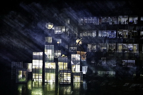 Die Bühne hat Lara Hohmann gebaut. Den Hintergrund beherrschen Projektionsflächen. Davor gibt es Holzkisten, die man als Miniatur-Hochhäuser interpretieren kann. Im Vordergrund links eine einzelne Holzkiste, die als Redner-Pult dient, in der Mitte eine kleine Kiste, die der Moderatorin als Sitzfläche dient. Rechts davon ist die Band aufgebaut. Vor der ist noch Platz für zwei grüne Flächen, auf denen orangefarbene „Einfamilienhäuser“ aufgestellt sind. Hohmann ist auch für die Kostüme zuständig. Moderatorin und Musiker sind in Cowboy-Hüte und Westernstiefel gekleidet, die Moderatorin zudem in einen karierten Hosenanzug. Derart schlecht gekleidete Menschen bekämen in Amerika in keiner Talk-Show eine Auftrittschance, aber die Botschaft kommt an. Der böse Kapitalismus kommt aus Amerika. Mehr Fantasie entwickelt die Kostümbildnerin bei den Gästen, die zwar gleichermaßen typisierend, aber doch abwechslungsreicher eingekleidet werden. Die Videos von Nazgol Emami zeigen Massenszenen, Bilder von amerikanischen Highways – aber wie will man den Kapitalismus in Bilder setzen? Sie rücken schnell in den Hintergrund, ergänzen das Bühnenbild hübsch, ohne zur Aussage wesentlich beizutragen. Keller hat die Personen und Räume gut im Griff; es gelingt ihm, das Stück rasch voranzutreiben, und etliche schöne Einfälle bereichern den Abend.