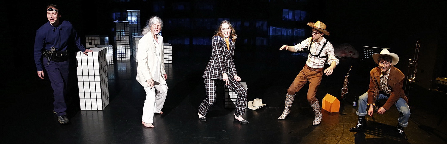 Die Bühne hat Lara Hohmann gebaut. Den Hintergrund beherrschen Projektionsflächen. Davor gibt es Holzkisten, die man als Miniatur-Hochhäuser interpretieren kann. Im Vordergrund links eine einzelne Holzkiste, die als Redner-Pult dient, in der Mitte eine kleine Kiste, die der Moderatorin als Sitzfläche dient. Rechts davon ist die Band aufgebaut. Vor der ist noch Platz für zwei grüne Flächen, auf denen orangefarbene „Einfamilienhäuser“ aufgestellt sind. Hohmann ist auch für die Kostüme zuständig. Moderatorin und Musiker sind in Cowboy-Hüte und Westernstiefel gekleidet, die Moderatorin zudem in einen karierten Hosenanzug. Derart schlecht gekleidete Menschen bekämen in Amerika in keiner Talk-Show eine Auftrittschance, aber die Botschaft kommt an. Der böse Kapitalismus kommt aus Amerika. Mehr Fantasie entwickelt die Kostümbildnerin bei den Gästen, die zwar gleichermaßen typisierend, aber doch abwechslungsreicher eingekleidet werden. Die Videos von Nazgol Emami zeigen Massenszenen, Bilder von amerikanischen Highways – aber wie will man den Kapitalismus in Bilder setzen? Sie rücken schnell in den Hintergrund, ergänzen das Bühnenbild hübsch, ohne zur Aussage wesentlich beizutragen. Keller hat die Personen und Räume gut im Griff; es gelingt ihm, das Stück rasch voranzutreiben, und etliche schöne Einfälle bereichern den Abend.