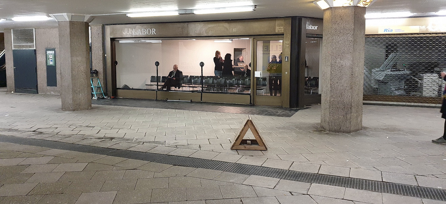 Das Labor Projekt­ga­lerie ist mit Stühlen vollge­stellt, die zur Scheibe hin ausge­richtet sind. Hinten links hat Timo Reuber seine Musik­anlage aufgebaut. Der Raum ist überfüllt. Es gibt längst nicht für alle Sitzplätze. Im Raum, aber auch vor dem Laden­lokal sind Lautsprecher aufge­stellt, die den Ort mit einer ausrei­chenden Beschallung versorgen.