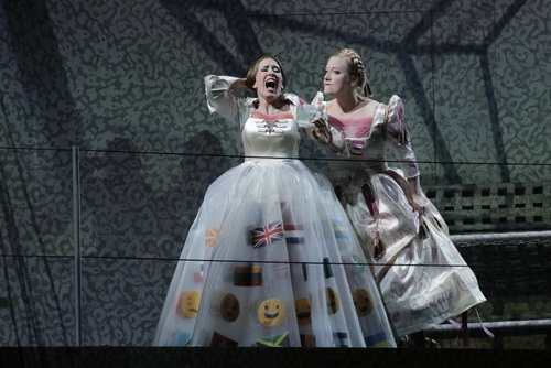 Da müssen sich überwiegend Debütanten bewähren. Kein Problem, die schau­spie­le­ri­schen Anfor­de­rungen bleiben durchaus überschaubar. Emily Hindrichs übernimmt die Rolle der Marie. Und hat damit neben dem Stolzius von Nikolay Borchev aus darstel­le­ri­scher Sicht sicher am meisten zu leisten. Ihre Verge­wal­tigung sollte sicher zu den eindrucks­vollsten Szenen gehören. Aber gerade da bleibt es beim Mummen­schanz. Das ist das Manko bei Padrissa. Es geht um die mediale Darstellung, die Technik, nicht um die Oper. Und so finden starke Szenen nebenbei statt. Trotzdem gestaltet Hindrichs die Rolle sänge­risch im Wesent­lichen eindrucksvoll. Wobei das vergleichs­weise schwierig ist, denn der Gesang ist Zimmer­manns Stärke nicht. Gleich­förmige Rezitative überwiegen. Dass trotzdem Elise Kaufman immer wieder auftaucht, um die notwendige Soufflage zu liefern, überrascht. Mögli­cher­weise liegt es daran, dass der Großteil des Ensembles sich aus den hausei­genen Sängern zusam­men­setzt, die eher selten mit neuer Musik in Berührung kommen. Trotzdem sind durch die Bank weg ordent­liche Ergeb­nisse mit hoher Textver­ständ­lichkeit zu hören. Stell­ver­tretend für gute Leistungen sollen hier Frank van Hove als Wesener, Judith Thielsen als Maries Schwester, Sharon Kempton als Gräfin de la Roche erwähnt werden. Für ihr großes Engagement ebenfalls zu loben sind die Choristen.