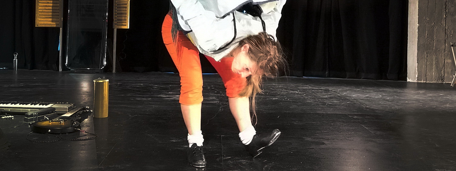 Perspektivwechsel hat sich auch Tsironi bei ihrer Trilogie Äther – Flakon – Splitter vorgenommen. Äther wurde in einem privaten Studio als Tanz-Solo aufgeführt. Bei Flakon ging es deutlich üppiger zu. Skurrile Typen, Projektionen und ein sprechender Computer sorgten für eine opulente Aufführung. Splitter nun gibt sich wieder deutlich spartanischer und thematisch abgehoben. Offensichtlich geht es in den Wilden Westen. Dafür spricht schon die eingespielte Musik, mit der der Abend beginnt. Eine Frau gräbt sich aus einem Erdloch. Befreit sich von ihren Reithosen. Und scheint unendlich erschöpft. Vom rechten Bühnenrand, wo auch die Technik untergebracht ist, schiebt sich eine Teleskopstange vor zum Musiker hinter der Säule in der Mitte der Spielfläche, der mit ebenerdiger E‑Piano-Tastatur, liegender E‑Gitarre und ein paar weiteren Instrumenten sowie einem Standmikrofon ausstaffiert ist. Der Stange folgt die zweite Tänzerin des Abends – auf einem Hoverboard. Das kennt man bereits aus Äther. Sie fährt weiter zur linken Bühnenhälfte, wo eine „Tanzfläche“ ausgelegt ist, die sich später als Flügel mit Krücken für die zweite Tänzerin entpuppen wird.