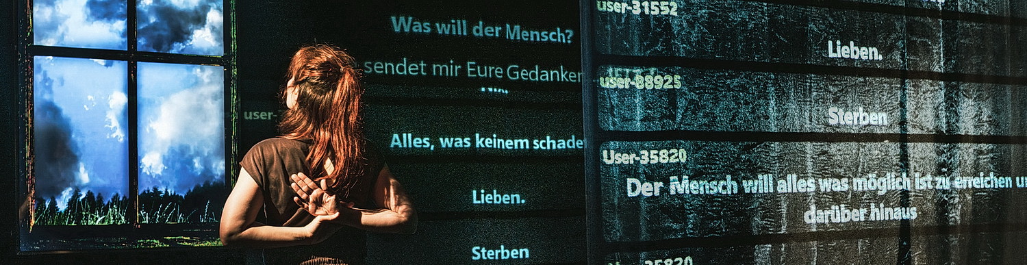 In der Wartezeit bis zum Einlass ist zu erfahren, dass das Hotel den Lockdown nicht überlebt hat, weshalb schon mal streckenweise der Strom abgestellt wurde. Das hat so ein bisschen was von The Shining von Stephen King. Auf einem Zettel wird dem Besucher erklärt, was er unternehmen muss, um sich in das Bühnengeschehen einzuloggen. Also WLAN aktivieren, das Lehnert hausintern eingerichtet hat, Barcode scannen, eine kurze Bestätigung und schon hat man die Möglichkeit, Kommentare zu senden. Kaum sind die Vorbereitungen abgeschlossen, bittet Regisseur, Schauspieler und Medienkünstler Lehnert zum Einlass. Es geht in einen kleinen Raum, ein Kellertheater eben. Wenige Stühle auf verschiedenen Ebenen angeordnet in schwarzen Wänden. Dahinter großräumig die Technik. Da fällt es nicht weiter auf, dass nur wenige Besucher erschienen sind. Durchweg junge Leute, die von Anfang an hochkonzentriert sind.