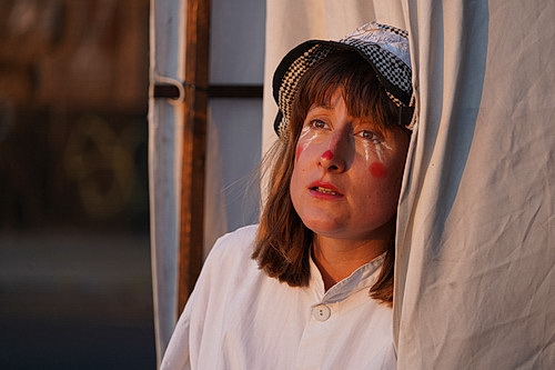 Bohr schlägt sich tapfer und zeigt viele Facetten des Immobilien-Vertriebs, wenn sie im roten Kleid gehetzt und mit Rollenkoffer ihre Bahnen zieht. Aber hinter der Ziehharmonika und der Gitarre herzuziehen, während man seine eigene Straße des Lebens erlebt, entlang am Rhein, dem Abend entgegen, dem Untergang entgegen, das hat eine ganz eigene Qualität. Kuklik hätte das nicht brillanter inszenieren können. Thomas Krutmann gibt einen wunderbar natürlichen Zampanò, Brecht wäre entzückt. Hier ist nichts gespielt. Die Panzerfaust der Männerbastion schlägt sich durchs Leben. Was einen herzlich wenig interessiert, wenn man Aischa-Lina Löbbert als Gelsomina erlebt. Die Nasenspitze rot gefärbt, verdient sie alle Schauspielerpreise dieser Welt. Allein der Blick verzaubert. Ihre Rolle als Clown gelingt sensationell. Dagegen verliert Giulietta Masina, Ehefrau Fellinis, die im Film mit ihrer Rolle als Gelsomina Weltruhm erlangte, um Längen. Es muss ein neuer Fellini kommen, um dieser Frau die richtigen Rollen zu verschaffen. Damit sie noch einmal am Rheinufer in den Poller Wiesen um Geld betteln darf, die Trompete entdecken, um Matto trauern kann.