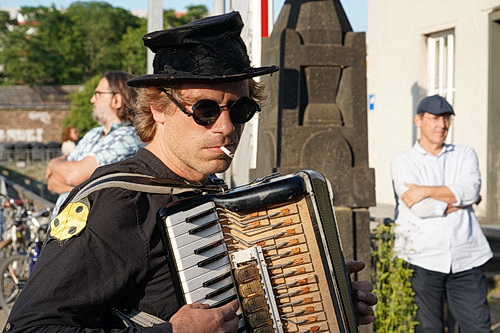 Ein alter, weißer Transporter überquert die historische Drehbrücke am Deutzer Hafen, hält direkt dahinter am Zollhaus. Zwei junge Frauen bauen einen Camping-Tisch und zwei Stühle auf. Nach und nach sammeln sich die Besucher, um dort ihre Eintrittskarten zu erwerben. Währenddessen sitzt Little Red Taxi Girl im Hintergrund und intoniert auf der Gitarre Blues und Folk, singt dazu ihre Lieder. Die milde Abendsonne verbreitet einen warmen Glanz über der Szene. Die beiden Damen, die fleißig Geld einsammeln und Stempel und Programmzettel verteilen, sind ein wenig nervös. Eigentlich ist die Veranstaltung schon nach den Voranmeldungen überbucht und ein paar Menschen versuchen noch an der Abendkasse ihr Glück. Schließlich werden es um die 85 Besucher, und keiner muss weggeschickt werden. Ein Ziehharmoniker-Spieler mischt sich in das Bild, einen Zylinder auf dem Kopf, eine dunkle Sonnenbrille verbirgt seine Augen. Auf dem Ärmel des schwarzen T‑Shirts ein gelber Aufnäher, der auf eine Sehbehinderung hinweisen könnte. Im Mundwinkel klemmt eine selbstgedrehte Zigarette. Er wird während des gesamten folgenden Geschehens schweigen, aber die Reisegruppe anführen. Eine Figur, wie sie Federico Fellini nicht hätte schöner erfinden können.