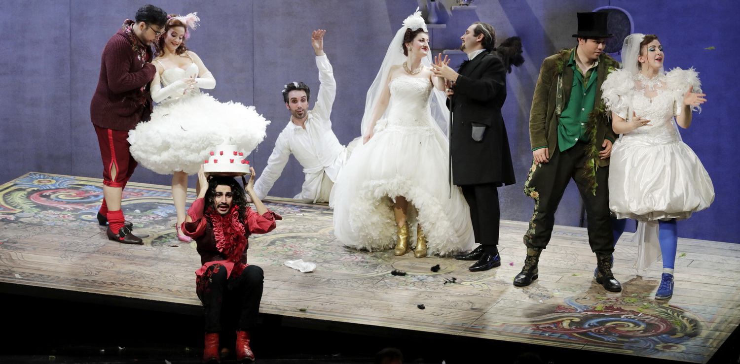 Die detail­lierte Formung der Figuren durch die Regis­seurin bietet den jungen Sängern beste Voraus­set­zungen, um sowohl ihre jugend­liche Spiel­freude ausleben zu können und sich gleich­zeitig von der Hand einer erfah­renen Regis­seurin leiten zu lassen. Und zu hören sind dabei einige Stimmen, denen man durchaus eine hoffnungs­volle Zukunft versprechen kann. Dazu gehört Maria Kublashvili als Contessa Armelinda, die bereits über eine ebenso große und geschmeidige Stimme verfügt wie über ein beacht­liches Charisma. Und die Talent­schmiede aus dem Fernen Osten zahlt sich auch hier aus mit dem Bariton Hoeup Choi und dem mit strah­lendem Glanz überzeu­genden Tenor Young Woo Kim. Aber auch die Sopra­nistin María Isabel Segarra, die Mezzo­so­pra­nistin Sara Jo Benoot und der Tenor Dino Lüthy lassen aufhorchen, während Yunus Schahinger als der intri­gante Vogel­fänger Pierotto stimmlich noch nicht gefestigt wirkt.