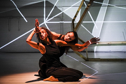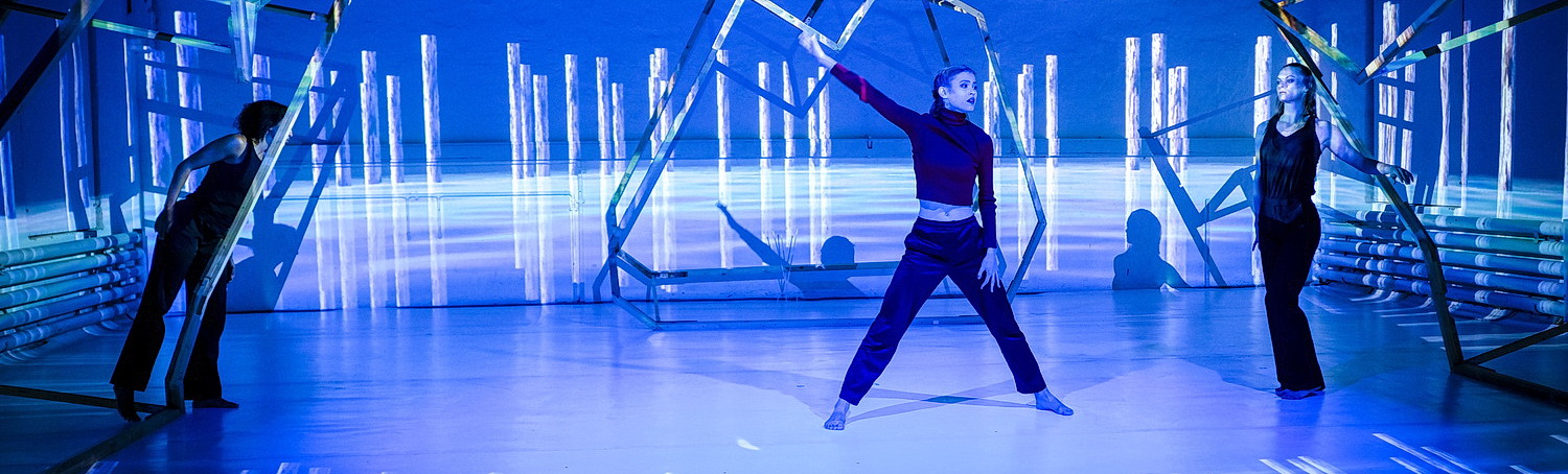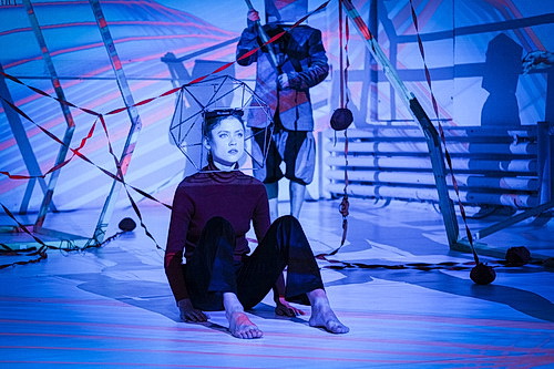 Während Waithera Schreyeck und Karolina Tóth, die beiden ganz in schwarz gekleideten Tänzerinnen in der Bühnenmitte, ihr Duo beginnen, übernimmt Kovács die Erzählung. Die geometrischen Formen weichen idyllischen Bildern von Venedigs Ufern. Lili Oksanen kommt in rotem Pullover und schwarzer Hose hinzu. Szabó erzählt von der Farbgebung, die sich von schwarz allmählich zu rot verfärbt, um die Gefahrenlage zu dramatisieren. Das bekommst du als Zuschauer nur unterschwellig mit. Allmählich brechen die Wasserfluten über die Bühne herein. Endlich finden sich die Tänzerinnen, die sich in die Umrisse der Villen zurückgezogen haben, in einer Welt von Tang oder Korallen wieder. Lenah Flaig, in ein Trikot mit Gaze-Maske gekleidet, an deren Hüften Knäuel angebracht sind, und Boshi Nawa in einem eher komischen Anzug betreten die Bühne mit einem fahrbaren Spiegel, um die Rettungsaktion einzuleiten. Mit Lampen werden die Schäden untersucht, der Spiegel dient der Inspektion der Atemfähigkeit, die Knäuel werden wie Sauerstoffleitungen ausgeworfen.