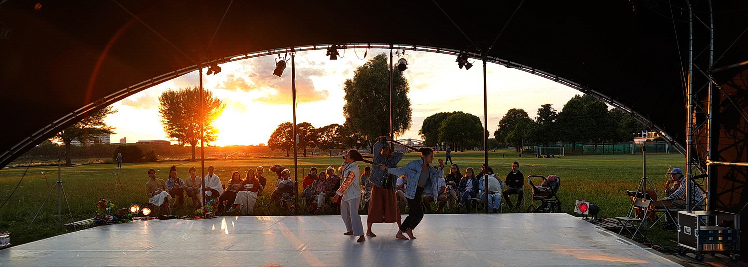 Seit 2018 beschäf­tigen sich die Künst­le­rinnen mit der Ausein­an­der­setzung von Begegnung und Konfron­tation in einer anderen Kultur. Das Ergebnis faszi­niert und nimmt gefangen. Und doch fragt man sich am Ende, wo eigentlich die Unter­schiede zu Feiern in Deutschland sind, gerade jetzt, wenn in Düsseldorf wieder die „größte Kirmes am Rhein“ ihre Pforten öffnet. Und erstaunt kann man feststellen, dass sich da manches doch eher ähnelt. Vielleicht wird hier mehr Alkohol getrunken, vielleicht sind die Tänze in den Kirmes­zelten stärker ritua­li­siert, weniger von Impro­vi­sation und Kunst­fer­tigkeit getragen, was auch an der Grobschläch­tigkeit der Musik liegen mag. Aber die Ähnlich­keiten sind unver­kennbar. Was ja zu einer durchaus positiven Erkenntnis führen könnte: Wer aufhört, nach den Unter­schieden zu fragen, kommt sich über Gemein­samkeit sehr schnell näher. Das gilt auch für diesen Abend. Nachdem die Künst­le­rinnen ausgiebig gefeiert worden sind, mischen sie sich rasch unter das Publikum, um für Gespräche zur Verfügung zu stehen. Und während die Feier auf den Poller Wiesen noch lange weitergeht, bereiten sich schon die nächsten Künstler auf ihren Auftritt dort vor. Am 20. Juli wird die Wander­thea­ter­gruppe Ton & Kirschen zu Gast sein, um eine „Melange aus Slapstick, Akrobatik und Puppen­spiel“ zu zeigen und damit die Legende vom heiligen Trinker zu erzählen.