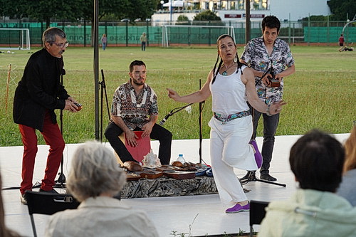 Kalima­rimba ist eine musika­lische Familie, die aus Tänzern und Musikern besteht und 1998 das Ensemble in Santiago di Chile gründete. Der Name ist eine Kombi­nation aus den beiden Rhyth­mus­in­stru­menten Kalimba und Marimba damit Programm. Auf der Bühne fallen sie durch ihre Origi­na­lität auf. Mit ihrer Musik, häufig eigene Kompo­si­tionen, schreiben sie die Gedichte ihrer Vorfahren weiter. In vielen ihrer Stücke geht es um den Respekt vor der Natur. Im Rahmen einer kleinen Europa-Tournee sind vier der Musiker nach Köln gekommen: Piny Levalle Saenz als Kopf des Ensembles, Claudia Campusano, Relmu Levalle Campusano und Tramel Levalle Campusano. Von anderen Künstlern ihres Heimat­landes heben sie sich durch eine origi­nelle Instru­men­ten­auswahl ab. Mit seinem Konzert Kalimba de los Andes entführt Kalima­rimba das Publikum in die musika­li­schen Welten des chile­ni­schen Hochlands. Dabei kommen Kalimbas, das perua­nische Cajón, Pututu, Teohti­huacana, Trompes und Ocarina als Instru­mente zum Einsatz. Zwar spielen die Musiker auf der Bühne, aber deren Rückwand ist entfernt, so dass sie im Licht der unter­ge­henden Sonne stehen. Ein fabel­haftes Bild, das ein offen­sichtlich fachkun­diges Publikum sehr konzen­triert zu genießen weiß. Zumal die Bestuhlung vom Rasen auf den Asphaltweg vorge­rückt ist und damit mehr Nähe erlaubt.