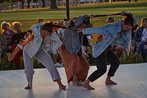 Jetzt also zeigen die drei Tänze­rinnen noch einmal ihr ganz persön­liches Tinku-Fest in natür­licher Umgebung. Und die Vorbe­reitung ist schon mal eindrucksvoll. Da flechten sich die drei gegen­seitig lange Zöpfe in die Haare. Kleiden sich in die Kostüme von Lena Kremer, die Trachten nachemp­funden zu sein scheinen. Kaum ist die 40-minütige Aufführung eröffnet, werden die Trachten mit ihren schweren, feder­be­wehrten Hüten wieder abgelegt, damit das Fest Fahrt aufnehmen kann. Zur Musik von Carlos Auza, der sie aus dem bolivia­ni­schen Cochabamba, wo das Tinku-Fest statt­findet, mitge­bracht hat, gibt es schnelle Rhyth­mus­folgen, bei denen die Tänze­rinnen sich ausweichen, um im nächsten Moment wieder aufein­an­der­zu­prallen. Es gibt Schein­kämpfe, bei denen die blanken Fäuste den Gesichtern der Gegner verdächtig nahe kommen. Endlich werden auch die Besucher in das Fest einbe­zogen. Schnell werden sie auf dem Bühnenrand hinge­setzt, mit Schirmen, Rettungs­decken und Getränken versorgt, ehe die Tänze­rinnen sich vollkommen veraus­gaben. Zwei „General­pausen“ unter­brechen die Aufführung, die mögli­cher­weise für die Akteure nötig sind, aber die Spannung ein wenig heraus­nehmen. Dem Gesamt­ein­druck des Stückes schadet das nicht.