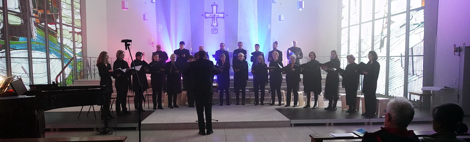 Die Joseph-Kirche liegt im Kölner Stadtteil Braunsfeld und lässt sich offenbar nicht ordentlich heizen. Jedenfalls ist es unterdurchschnittlich kühl im Kirchenraum. Der Altarraum ist vor der Aufführung eingenebelt worden, um die Wirkung der eigens installierten Lichtorgel zur Geltung zu bringen. Das gelingt eindrucksvoll. So entsteht eine leicht wabernde Atmosphäre, die ganz ausgezeichnet zum Vortrag passt. Unmittelbar vor dem Altarraum ist der Chor halbkreisförmig in zwei Ebenen angeordnet, links davon sind ein Harmonium und dahinter ein Flügel aufgestellt.
