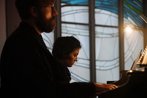 Für Les Lumières, den Kammerchor aus Köln, der an diesem Spätnachmittag mit 21 Menschen antritt, zunächst vollkommen uninteressant. Da ist ein großes Orchester wie etwa bei der Aufführung des Konzertchors Ratingen 2017 nicht zu leisten. Aber Michel Rychlinski, künstlerischer Leiter und Dirigent des Kammerchors, lässt sich von solchen Hindernissen nicht abhalten. Er beauftragt seinen Freund Olivier Schmitt mit einer Transkription für dessen Leibinstrument, das Harmonium, und Klavier.