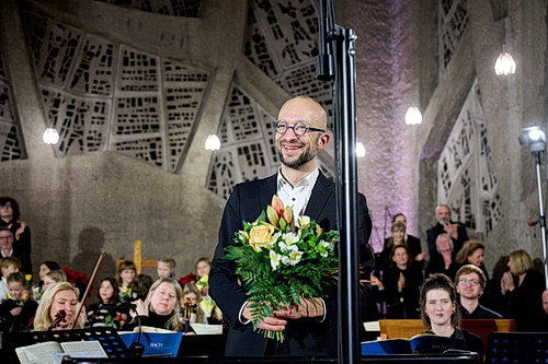 Nun, es könnten auch die Hirten sein, diejenigen, von denen in der zweiten Kantate so ausgiebig die Rede ist. Tatsächlich, denkt man sich, da sind sie doch, die großen Stauneaugen, die „des Herren Engel“, der Erzählung zufolge, zu Kronzeugen des Weihnachtswunders bestimmt hat. In Bayenthal erscheinen sie als Galerie von I‑Dötzchen, die stolz sind wie Oskar, jetzt und hier bei der Aufführung mitengagiert zu sein. Immer wieder dürfen sie im weiteren Verlauf die Choräle mitsingen. Auswendig. Mit dem Lesen, speziell mit dem Notenlesen ist es mit Sicherheit noch nicht soweit. Ist beim alten Bach übrigens auch nicht anders gewesen. Die Melodien, die Worte hat man mitgebracht. Klar, heute muss in diesem Punkt ein wenig nachgeholfen werden, was im Fall der Knirpse von der 3b die Klassenlehrerin Lissa Sutter besorgt hat, wie wir das im Nachgang einem liebevollen, einmal nicht gegenderten Programmheft entnehmen. Aufmerksam steht Sutter neben ihren Schützlingen. Den Einsatz muss sie ihren kleinen Choristen nicht großartig geben. Die wissen, wann und womit sie dran sind. Alles klappt wie am Schnürchen!
