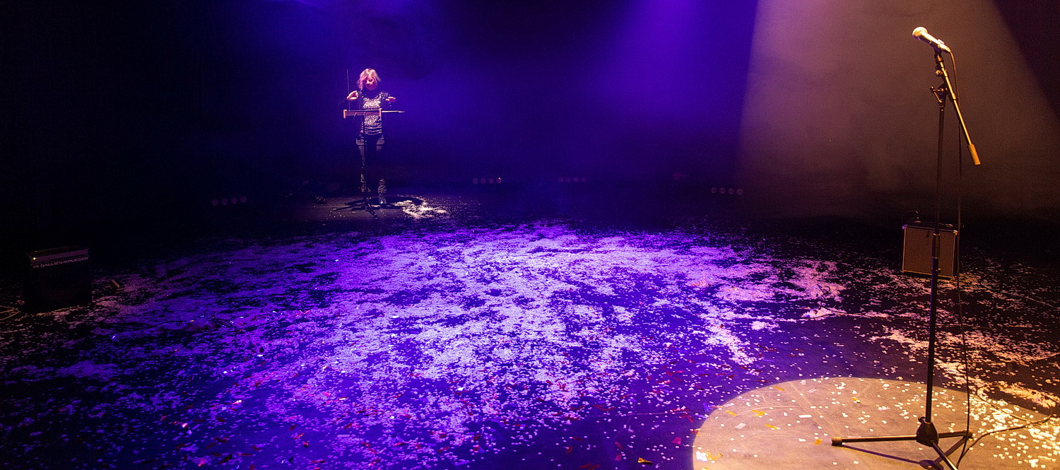 Und es wird eine rauschende Feier. Da schaut man gern anschließend über Kunst­namen und englische Titel hinweg. Das Schöne an der Orangerie ist, dass Bühnen- und Publi­kumsraum frei gestaltbar sind. Da gerät jede neue Aufführung zur Überra­schung. Das Ensemble um Theresa Hupp entscheidet sich für die konser­vative Variante. Großer Bühnenraum mit Tribüne vor Kopf. Neben der Tribüne ist die Technik aufgebaut. Die Bühne selbst hat Regis­seurin Sandra Reitmayer mit wenigen Mitteln großartig einge­richtet. In der Bühnen­mitte ist ein Material aufge­tragen, das an Eiskris­talle erinnert. Im Bühnen­hin­ter­grund sind Musik­in­stru­mente aufgebaut. Im Vorder­grund stehen zwei Mikrofone. Ein bisschen – viel – Bühnen­nebel lässt das Licht von Boris Kahnert in voller Wirkung erstrahlen. Vom Spotlight über die intime Beleuchtung bis zur großen Konzert­be­leuchtung ist hier alles drin. Und das hat seinen Grund.