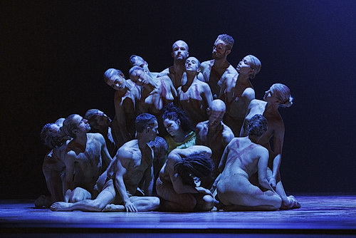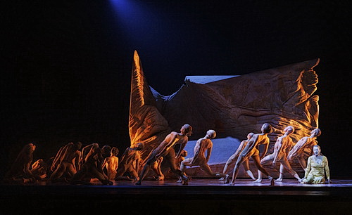 Aus dem Dunkel kristallisiert sich eine Skulptur heraus, die – gold oder rosa angestrahlt – als Teil eines menschlichen Torsos gedeutet werden kann. Vielleicht auch, je nach Fantasie, als Tor zur Hölle oder erotischer Schlund. Sie dient vereinzelt den Sängern als Tribüne. So der vorzüglichen Baráth für die wundervolle Arie Soffre im mio cor des Sifare. Ihre eigentliche Funktion wird offenbar, als sich in der Skulptur und um sie herum nackte Menschenkörper in fleischfarbenen Trikots zu den Arien und orchestralen Klanglinien Mozarts bewegen. Zumeist langsam, wie in slow motion, und in kunstvollen Wellen, deren Auf und Ab an Vogelschwärme und deren Fähigkeit erinnert, die Richtung ohne Kollisionen untereinander zu ändern.