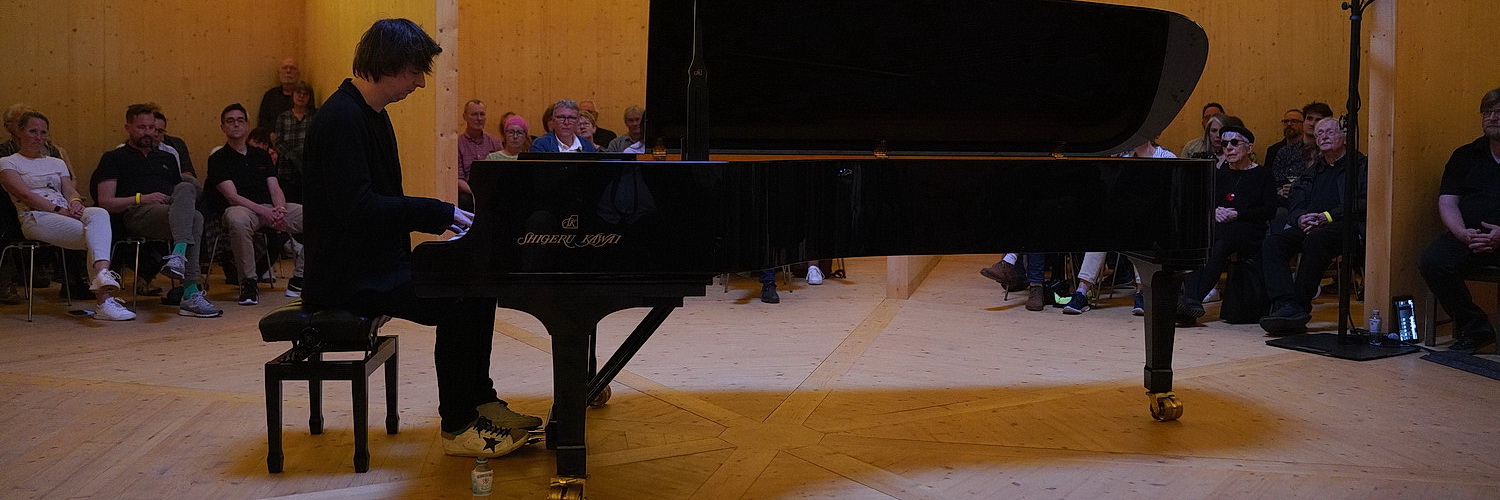 Mit fünf Jahren bekommt Michael Unterricht an Klavier und Geige, seine große Schwester bringt ihm als Flötistin die klassische Romantik näher. Sein Aufstieg ist eher kometenhaft. Der gebürtige Schweinfurter studiert in Würzburg, wird ins BundesJugendJazzOrchester aufgenommen, gründet eigene Ensembles, arbeitet mit den Größen des deutschen Jazz. Alsbald öffnet sich auch die internationale Bühne. In Krefeld war er bereits 2019. Da präsentierte er seinen Kompositionsauftrag für den Eröffnungsabend des Festivals 100 Jahre Bauhaus als Suite Bau.Haus.Klang. Jetzt betritt er forsch mit tänzelnden Schritten das Zentrum des Pavillons, verbeugt sich kurz in alle Richtungen, denn das Publikum ist kreisförmig um den mittig aufgestellten Flügel gesetzt. Ein Lächeln, ein paar Papiere flattern in den Flügel, dann liegen die Hände auf den Tasten und Wollny geht in seine Welt.