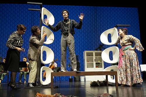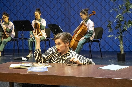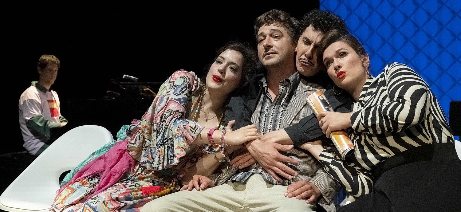 Was Hüve insze­niert, ist weniger eine Revue als vielmehr ein Pasticcio, also in eine Handlung einge­bettete Gesangs­dar­bie­tungen. Da verfügt das Theater Krefeld Mönchen­gladbach inzwi­schen über beträcht­liche Erfahrung. Und die Handlung vermeidet jeden Klamauk, sondern setzt statt­dessen auf herrlich einfalls­reichen Humor in den Dialogen. Kluger Witz begeistert das Publikum über 90 Minuten. Das muss man auch erst mal schaffen. Zunächst tritt die Musik auf den Plan. Die Nieder­rhei­ni­schen Sympto­miker bestehen aus Beatriz Moura und Kiki Shibayama an den Geigen, Raquel Cobo Álvarez an der Bratsche und Catarina Nunes am Cello, die sich der Leitung von Repetitor Avishay Shalom am Flügel anver­trauen. Sie eröffnen den Abend mit der Air aus Orches­ter­suite Nr. 3 in D‑Dur, BWV 1068, von Johann Sebastian Bach. Maya Blaustein inter­pre­tiert als Tina La Mesybau anschließend Der Zwerg von Franz Schubert in farben­froher Kleidung. Sie bringt damit noch einmal in Erinnerung, wie viel Spaß sie dem Publikum in den vergan­genen drei Jahren mit ihrer Spiel­freude bereitet hat. Und das wird sich im weiteren Verlauf noch steigern. Guillem Batllori tritt als eindeutig bezie­hungs­ge­störter Bariton auf, dessen Traurigkeit behoben werden muss. Klar, wenn er auch als Rodrigo in der zweiten Szene des dritten Akts mit Son io, mio Carlo aus Giuseppe Verdis Don Carlos antritt. „Du bist nicht tot“, erklärt ihm die Stimme aus dem Off. Na, dann besteht ja noch Hoffnung. Schwie­riger wird es bei Boshana Milkov in ihrer Rolle als Mia von Lobshak, wenn sie Losing My Mind inter­pre­tiert. Damit leidet sie eindeutig unter Sondheim. Um Steven Sondheim zu bekämpfen, helfe nur noch eine Rossini-Kur, befindet der Therapeut. Es ist großartig. Und schlägt immer höhere Wellen, die viel von Situa­ti­ons­komik leben und deshalb hier auch nicht weiter beschrieben werden. Tenor Robin Grunwald tritt als Bruno Warnglid an, um eine Inter­pre­tation von Bonnie Tylers Welterfolg Total Eclipse Of The Heart abzuliefern, die zum Nieder­knien ist.