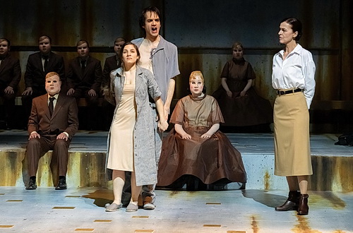 Dabei hat sich Kirsten Dephoff, die für Kostüme und Bühnenbild zuständig ist, alle Mühe gegeben, ein Einheitsbühnenbild zu schaffen, das beiden Ebenen gerecht wird. Und das ist durchaus gelungen. An den drei grauen Wänden läuft der Rost herunter, während der Bühnenraum mit einem Podest im hinteren Bereich Gelegenheit für interessante Spiel- und Choreografie-Szenen gibt. So ist der Raum im ersten Akt mit Liegen vollgestellt, im zweiten Akt bietet er viel Platz für die Bewegungen des Chors. Udo Baum sorgt immer wieder für überzeugende, detaillierte Lichteffekte, die die Aufführung deutlich bereichern. Bei den Kostümen überwiegen Brauntöne, aber Dephoff verzichtet auf die stereotypen SS-Ledermäntel und Hakenkreuz-Armbinden. Sehr erfreulich.