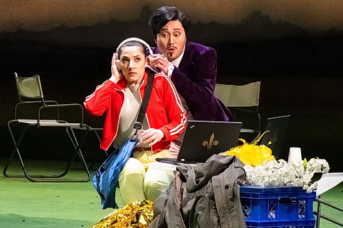 Selbstbewusst hat sich das Theater Krefeld Mönchengladbach nun an die Umsetzung gewagt und den Namen lieber erst mal ins Deutsche übersetzt. Mit der Regie der Reise nach Reims wurde Jan Eßinger beauftragt. Eine goldrichtige Entscheidung. Der Mann hat Musiktheaterregie in Hamburg studiert und ist seit 2017 als freiberuflicher Regisseur unterwegs. Seine Idee besticht und lässt sich gut in einer Zeitungsüberschrift zusammenfassen. Sensationsfund am Niederrhein! In seiner Fassung wird bei archäologischen Grabungen eine Kutsche mit einer Reisegesellschaft irgendwo am Niederrhein ausgebuddelt. Das Unglaubliche: Die Menschen leben. Das letzte, woran sie sich erinnern können, ist, dass sie auf der Reise nach Reims waren, wohin sie auch schnellstens wieder zurückwollen, weil dort Kaiser Karl X. gekrönt werden soll. Die Archäologen finden rasch eine Lösung. Sie bestellen eine Zeitmaschine, um die Gesellschaft wieder in ihre Zeit zurückzubefördern. Weiß ja jeder, dass 2024 solche Zeitmaschinen einfach geordert werden können, wenn man die richtigen Bezugsquellen im Internet kennt. Genau wie jeder weiß, dass die Zustellung dieser Dinger ziemlich umständlich ist und man einige Zeit in Kauf nehmen muss, bis so ein Gerät im eigenen Garten steht. Damit ist die Geschichte eigentlich zu Ende. Aber so einfach ist es dann doch nicht. Viel mehr möchte man gar nicht von dieser wunderbar intelligenten Inszenierung erzählen, um die Überraschungen nicht zu verderben, die die 200 Jahre alte Oper bis zum Ende bietet. Also zumindest in Krefeld. Denn Eßinger gelingt es, seine Geschichte so zu erzählen, dass er den alten Stoff so in seine Erzählung einbettet, dass er sie nicht biegen und brechen muss. Benita Roth hat ihm dazu ein naturalistisches Bühnenbild gebaut, wie man es in modernen Inszenierungen nur noch selten findet – und wie es die Zuschauer doch immer wieder vermissen. Rechts im Vordergrund gibt es das Grabungsfeld, links einen Hügel und einen Ansitz, im Hintergrund hängt ein Bühnenprospekt, das die – idyllische – niederrheinische Landschaft zeigt. Ihre Kostüme charakterisieren einerseits die Reisenden aus dem 19. Jahrhundert, andererseits die Entourage um die Archäologen treffend. Hier wird wenig herumgealbert, sondern mehr Wert darauf gelegt, dass die Zuschauer die Beziehungsverhältnisse der Personen untereinander erkennen können. Und das ist außerordentlich hilfreich. Udo Baum sorgt für nicht immer nachvollziehbare, aber in jedem Fall die Stimmung unterstreichende Lichteffekte. Dass der Spaß nicht zu kurzkommt, dafür sorgen unter anderem die Übertitel, die zum einen recht frei übersetzt sind, andererseits Kommentare seitens der Spielleitung einstreuen, die für mehr als einen Lacher sorgen.