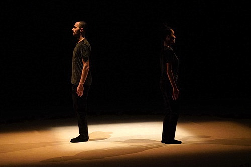 Die Bühne ist geräumt. Hintergrund und Seiten sind schwarz abgehängt. Mattern hat seinen Platz eingenommen und lässt Lichtquadrate auf dem Bühnenboden erscheinen. Zhang und Strathmann stehen nebeneinander inmitten eines Quadrats. Mit dem Rücken zum imaginären Publikum. Sie schauen also in die gleiche Richtung wie das Publikum. Das ist so gewollt. Maximal eine Vierteldrehung ist vorgesehen. Das Ticken des Taktgebers im Smartphone gibt die Geschwindigkeit vor. Mit hohem Tempo setzen die Tänzer winzige Schritte, während die Arme herunterhängen. Nahezu unbemerkt entstehen so räumliche Bewegungen, die die beiden Körper unentwegt in neue Beziehungen zueinander setzen. Die nahezu starren Körper unterdrücken dabei jede Emotionalität. Das ändert sich auch nicht, als später Klanglandschaften eingespielt werden. Die Beziehung zur Musik ist, wie so oft bei Choreografen, schwierig. „Kai hat diese Musik komponiert. Und gleichzeitig haben wir für Musik und Tanz die Komposition gewogen. Und dann haben wir festgestellt tatsächlich, für Tanz Musik zu komponieren, ist eher für die Augen statt für die Ohren. Weil das immer eine Raum-Zeit-Ordnung ist. Ist nicht einseitig. Sondern man muss eher gucken, ob hier Musik zu stark ist, oder ob hier Bewegung zu schwach ist“, erläutert Zhang die gefundene Symbiose. „Somit ist Musik zwar auf eine Art sehr wichtig. Weil es immer irgendeine Art von Inspiration ist. Aber es darf keine begleitende Tanzmusik sein. Weil das für unseren Anspruch einfach nicht mehr das ist, was wir suchen“, fügt Strathmann hinzu.