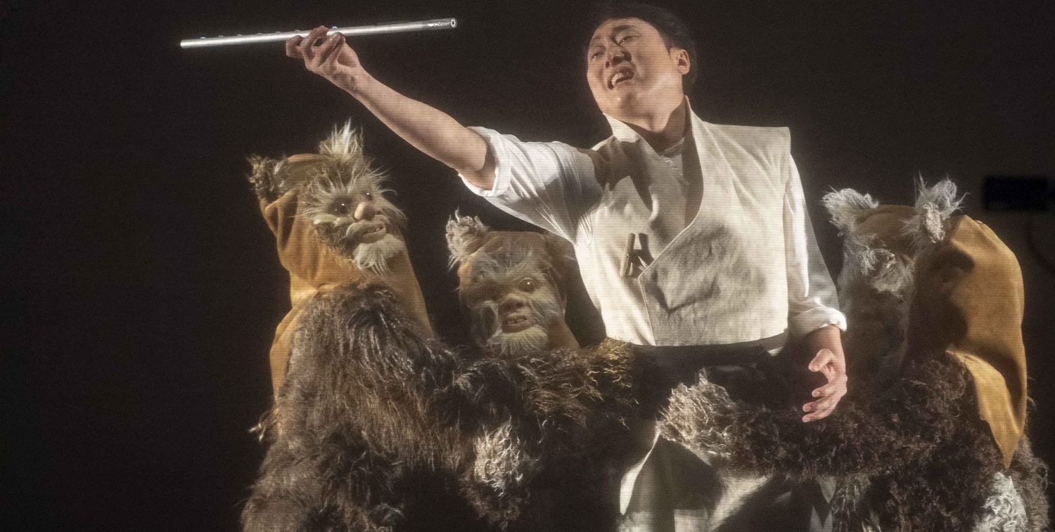 Nach den Lobhudeleien der Lokalpresse im Anschluss an die Premiere könnte man glauben, dass das Stück Jugendliche reihenweise ins Theater lockt. Nichts davon ist im immerhin ausverkauften Haus zu sehen. Vielleicht liegt es daran, dass Filme wie Star Wars, Star Trek oder E.T. für die Jugendlichen längst historische Schinken sind. Sie kommen alle vor: Mr Spock, E.T., die Ewoks, Jedi-Ritter, Darth Vader und wie sie alle heißen, die Helden der amerikanischen Filmproduktionen vergangener Tage. Das manifestiert sich für die Eingeweihten in erster Linie in den Kostümen und Masken. Für alle anderen sehen die Helden der Zauberflöte vermutlich einfach ein bisschen merkwürdig aus. Aber auch die Science-Fiction-Landschaften greift van Rensburg auf, wenn er die Bühne als Bluescreen-Box gestaltet, über der eine Leinwand die Darsteller in die entsprechende Umgebung versetzt. Ein Gaze-Vorhang, der zwischenzeitlich immer mal wieder heruntergelassen wird, bietet viel Platz für Sternenbilder und Symbole. Das wirkt erstmal überwältigend, aber alsbald offenbaren sich auch die Tücken. Die Lippenbewegungen von Sängern und Leinwand-Darstellern stimmen nicht überein. Echte Blickfänge gibt es selten, weil der Blick ständig zwischen Leinwand und Bühne wandert. Und letztlich gibt es außer Auf- und Abgängen wenig Bewegung auf der Bühne, weil sich das Geschehen ja auf der Leinwand abspielt. Also ein Ausschnitt des Geschehens. Dadurch, dass die Leinwand relativ weit vorne aufgehängt ist und der Raum dahinter offen ist, gerät die Akustik zum Fiasko. Auf Übertitel wird verzichtet, um die Reizüberflutung nicht noch weiter voranzutreiben.