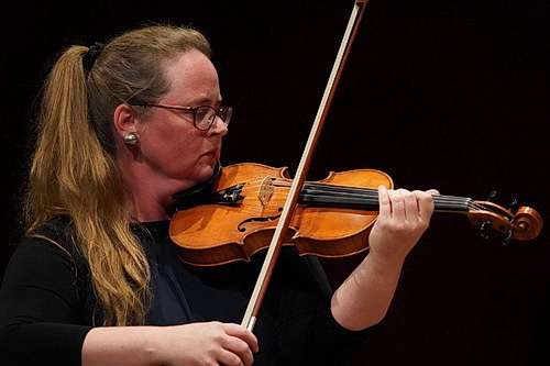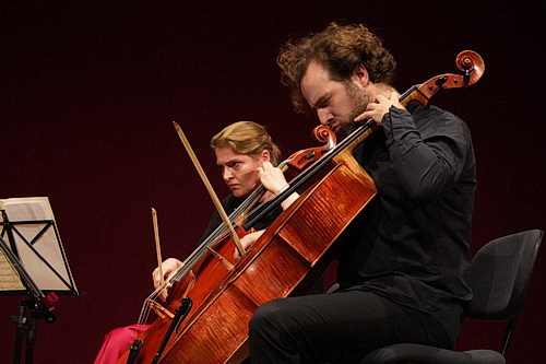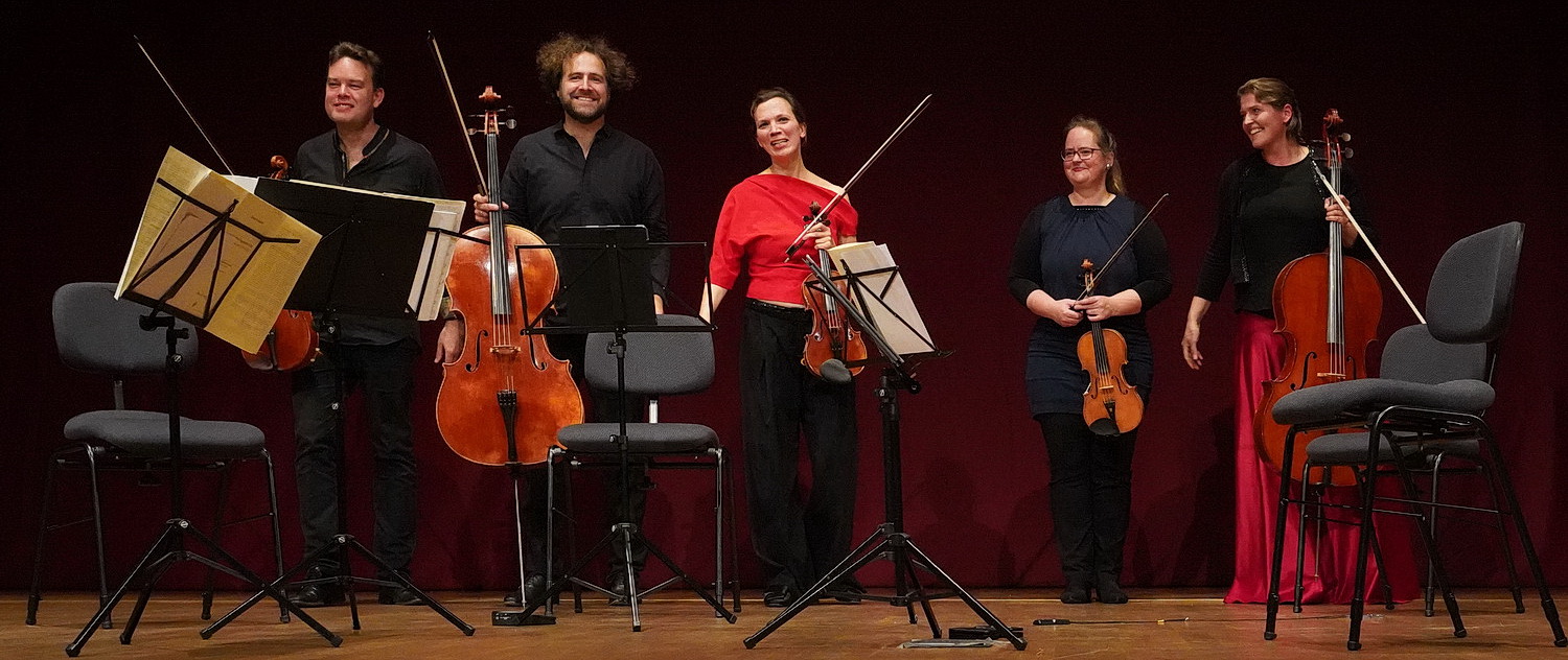 So verschwinden die Streicher ganz konventionell im Halbkreis hinter ihren Notenständern. Die folgenden 50 Minuten sind deutlich von Spielfreude und Expressivität gezeichnet. Während Geigerin Nina Reddig hochkonzentriert über Einsätze wacht und auf kurze Pausen achtet, bemüht sich Annette Walther mit der zweiten Violine, so etwas wie außermusikalische Stimmung aufzubauen. Da darf sich der Körper schon mal bewegen, fröhliche Mimik ist ebenso erlaubt wie großes Erstaunen oder Verwunderung. Ein sehr schöner Einsatz, der auch visuell das Konzert bereichert. Auch Gareth Lubbe hat schon mal den Schalk im Nacken, wenn er beispielsweise seine Bratsche zupft. Hannah Weber sitzt halb verdeckt hinter ihrem Cello-Kollegen Julian Arp. Mit großer Souveränität erzählen die Musiker auf ihren Instrumenten, was das Streichquintett so wertvoll macht: Wie es aus der zeitlosen Melodie in die ja schon fast wütenden Kontraste geht, aus zarten Momenten in verwunschene Welten, um endlich in verwegenen Schlüssen eigentlich schon Lust auf mehr zu machen. In den vier Sätzen ist die Komplexität eines ganzen Kosmos eingebunden. Und dem Quintett gelingt es, diese beherzt zu erfassen und dem Publikum zu vermitteln.