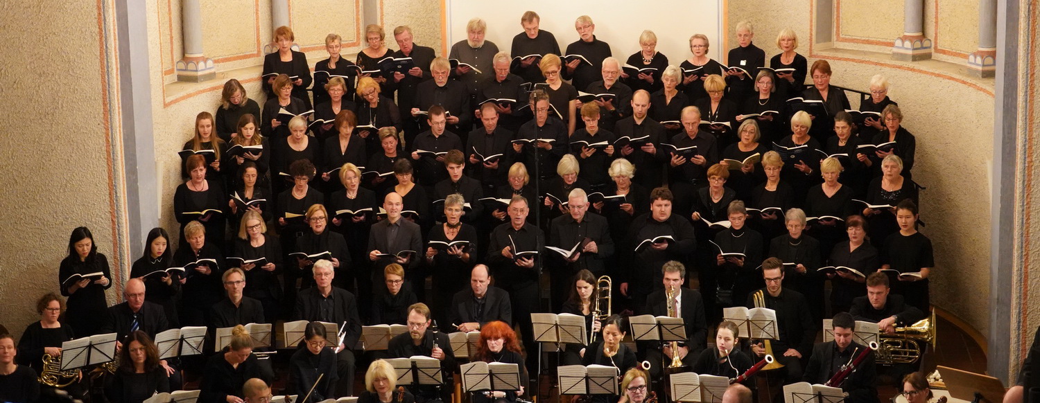 Die Erlöser­kirche in Langenfeld im Rheinland wurde am 28. November 1909 einge­weiht. Ab 1975 wird der Innenraum umgestaltet. Dem Paradig­men­wechsel der Evange­li­schen Kirche folgend, dass nicht der Pfarrer den Gottes­dienst hält, sondern die Gemeinde ihn feiert, wird der Altarraum bis 1981 erweitert. Für den Gottes­dienst mögli­cher­weise eine Berei­cherung, für die Aufführung eines Requiems erweckt die Raumge­staltung erst mal Skepsis. Zumal die Kirche in der Größen­ordnung einer ganz normalen Stadt­kirche liegt, auch wenn sie archi­tek­to­nisch, von außen betrachtet, ein Schmuck­stück ist.