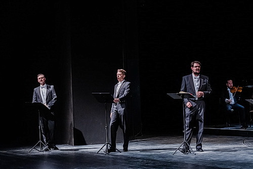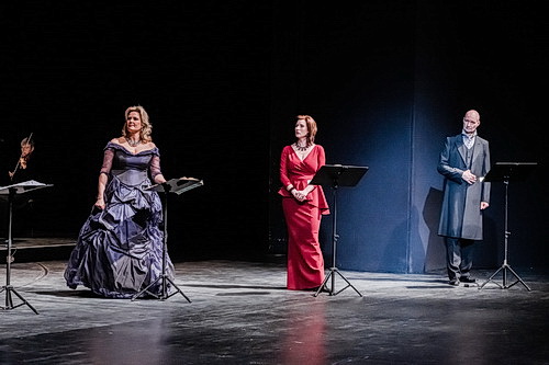 Liudmila Lokaichuk überzeugt mit leichtem und hellem Sopran als italie­nische Sängerin, während Alvaro Zambrano mit ausdrucks­starkem Tenor ihren italie­ni­schen Counterpart darstellt. Roman Trekel in der Besetzung des Grafen darf mit seinem markanten Bass-Bariton schon als Luxus­be­setzung angesehen werden. Sven Hjörleifsson als Monsieur Taupe, Martin Blasius als Haushof­meister und James Moellenhoff als Diener reihen sich gesanglich in das hohe Niveau des Ensembles ein.