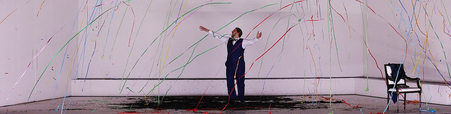 Der rote Parzen-Faden tritt aus dem mythi­schen Dunkel des sich öffnenden Zwischen­raums ins Offene der gesamten Bühne. Ein aus roten Fäden gewirktes Netz spannt sich über die von Fantin zu einer in Guckkas­ten­per­spektive verklei­nerten Breit­wand­bühne des Opern­hauses. In der verspie­gelten Bühnen­rückwand verdoppeln sich nicht nur die Protago­nisten des Spiels wie vorher schon auf den weißen Wänden in Schat­ten­ge­stalten. Ebenso spiegelt sich in ihr Dirigent Rúben Dubrovsky und baut damit eine optische Brücke in den Zuschau­erraum. Das Opern­ge­schehen, drama­ti­siert im Libretto von Nicola Francesco Haym nach Francesco Bussani, ist im Heute angekommen.