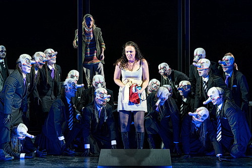 Aus einem umfang­reichen Solisten-Ensemble ragt Nicole Chevalier mit einer nicht durch­gängig diffe­ren­zierten Bühnen­präsenz heraus. Die Darstellung von Marys Wandlungen von hoffender Zuver­sicht, das Volk und die Lords – kostü­miert wie Wieder­gänger aus dem Cabinet des Dr. Caligari, frisiert in der Anmutung von Samurai-Kämpfern – mögen sie als Königin akzep­tieren bis zu einer an ihrem eigenen Macht­willen zerbre­chenden Frau, lebt von dem fabulierten Libretto-Konstrukt. Die Schwie­rig­keiten, diese Momente nachvoll­ziehbar spiele­risch darzu­stellen, ist vielleicht eine der Erklä­rungen dafür, warum diese Oper bisher keinen Platz auf deutschen Opern­bühnen gefunden hat.