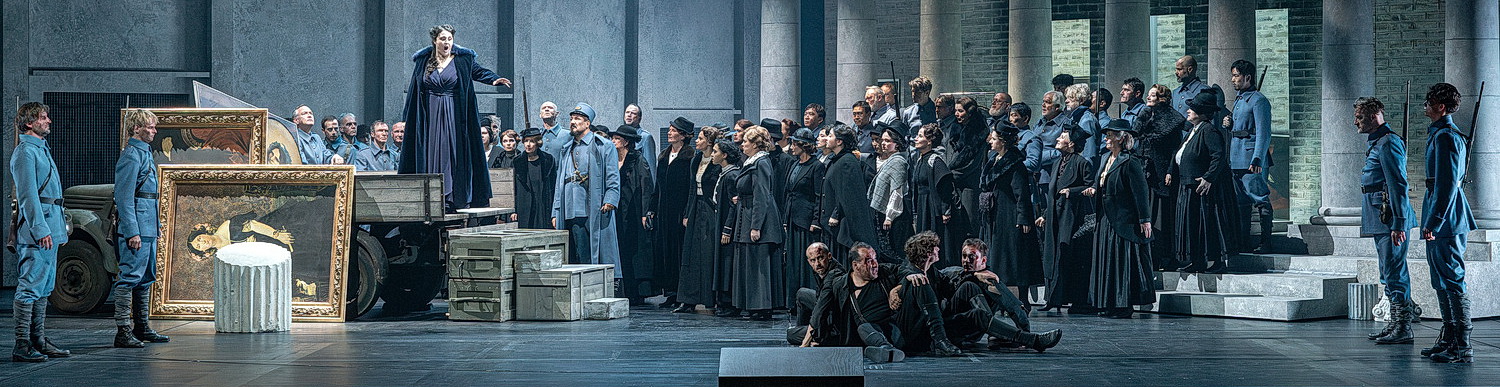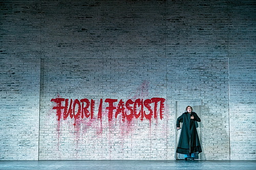 Warum allerdings das martialisch Diktatorische mit militärischen Uniformen aus der Zeit zwischen den beiden Weltkriegen des 20. Jahrhunderts dargestellt wird, ist eine wenig verifizierbare Idee der Inszenierung. Der auf die Wand gesprayte Aufruf Fuori i Fachisti, also Faschisten raus, assoziiert Mussolinis Intention mit dem Marsch auf Rom 1922. Die demonstrative Strategie einer solchen politischen Massendiktatur findet sich indirekt auch in Normas Priesterherrschaft wieder. Der so genannte Erfolg wird solange garantiert, bis politische Konstellationen sich grundsätzlich ändern oder, wie im Fall von Norma, der religiöse Kult in Gefahr ist.
