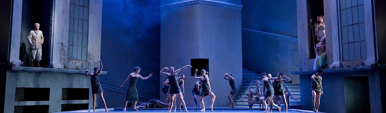Den aktuellen Leipziger Ring insze­nierte Rosamund Gilmore, die sich erstmalig mit dem Werk in Leipzig beschäf­tigte. Gilmore wollte sich frei machen von den vielen Inter­pre­ta­ti­ons­ver­suchen des Werkes in den letzten Jahrzehnten, sie wollte eine Geschichte erzählen, in der das mensch­liche, aber auch das psycho­lo­gische Element im Vorder­grund stehen. Ihre Götter sind Menschen mit göttlichen Acces­soires, durchaus arche­ty­pisch, aber fehlbar und beein­flussbar. Und sie möchte die komödi­an­ti­schen Elemente, die es im Rheingold ja durchaus gibt, den zerstö­re­ri­schen Handlungen gegen­über­stellen. Ihre Darstellung ist der Übergangs­moment vom archai­schen, zeitlosen Mythos in die Geschichte zu dem Zeitpunkt, in dem die Hoffnung auf die Zukunft gerichtet ist. Angesiedelt von der Ausstattung und den Kostümen ist das Rheingold in der Zeit seiner Entste­hungs­ge­schichte, also zu Beginn der zweiten Hälfte des 19. Jahrhun­derts, doch das Konzept ist zeitge­schichtlich nach vorne gerichtet, und die Götter­däm­merung wird dann in der aktuellen Gegenwart spielen. Gilmore bedient sich in ihrer Erzählung eines choreo­gra­fi­schen Ansatzes und hält sich dabei sehr dicht an den Text. Elf Tänzer, auch als mythische Elemente bezeichnet, sind omnipräsent auf der Bühne und illus­trieren, beobachten und begleiten das Geschehen und sind der zentrale Mittel­punkt der Insze­nierung. Sie sind Helfers­helfer der Protago­nisten, stellen in der Verwand­lungs­szene im dritten Bild Riesenwurm und Kröte dar, sind die geknech­teten Nibelungen, erscheinen als Wotans Raben oder als Nornen in der Erda-Szene, ein gelun­gener Verweis auf die drohende Götter­däm­merung, und bewegen während der offenen Wechsel zwischen den einzelnen Bildern grazil die wenigen Requi­siten hin und her. Ihre elasti­schen Körper­hüllen lassen viel Spielraum für Verwandlung, Fantasie und Mythos zu. Gilmore, die über eine klassische Ballett­aus­bildung verfügt, hat die Choreo­grafie ganz der Musik unter­ge­ordnet. Die wogende Welle, das Charak­te­ris­tikum im Rheingold, wird von den Tänzern aufge­nommen und setzt sich über das gesamte Werk fort.