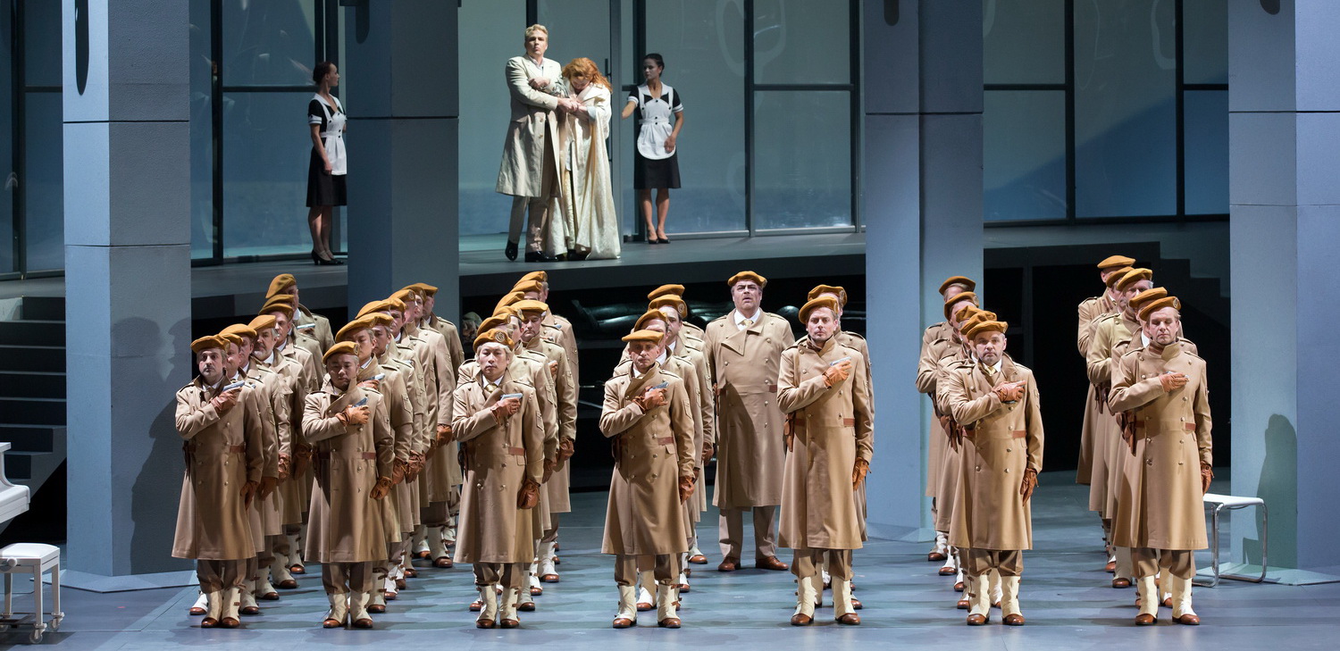 Großartig auch die Idee, die Göttererscheinungen auf die Bühne zu bringen. Ein düstrer Tag dämmert den Göttern verkündet Erda schon im Rheingold, und es sind Wotans Worte an Brünnhilde in der Walküre, wenn er voller Verzweiflung prognostiziert: nur eines will ich noch: das Ende … Und die Götter fürchten um ihr Ende. Obwohl keiner von ihnen mehr als Figur in der Götterdämmerung erscheint, geht es letztendlich um sie, um ihr Ende, und damit auch das Ende einer dekadenten Herrschaft. Gilmores Kunstgriff, mit Hilfe der Göttererscheinungen Wotan, Fricka, Freia, Froh und Donner als ängstlich beobachtende Gestalten, die auf ihr Ende warten, mehrfach kurz auf die Bühne zu bringen, ist nicht nur ein interessanter Regiekniff, es ist auch die immerwährende Mahnung, dass alles endlich ist, auch die Herrschaft der eigentlich unsterblichen Götter. Wenn am Schluss das Bühnenbild ineinander zerfällt, die Götter im wahrsten Sinne des Wortes untergehen, dann wird die Götterdämmerung wörtlich zitiert. Doch Gilmore erzählt nicht nur in fesselnden Bildern, sondern sie ordnet den Figuren auch eine dezidierte Rolle in diesem Gefüge zu und bleibt damit ihrem bekannten Linienkonzept der ersten drei Werke treu. Im Zentrum steht Hagen, Alberichs Sohn. Ein Antiheld, gefühlskalt und von Hass beseelt. Sein ausschließlicher Sinn ist es, den Ring, der unendliche Macht verheißt, von Siegfried zu gewinnen. Nicht für Alberich, sondern für sich. Hagen ist eine eigenständige Persönlichkeit, der in seinem strategischen Denken seinen Vater Alberich um Längen überragt und ein Meister der Manipulation ist. Seine Halbgeschwister Gunther und Gutrune, die Gibichungen, sind da nur schwache, willfährige Objekte. Die Gibichungen sind eine reiche, verwöhnte, dekadente, aber verschwächlichte Gesellschaft, die von Hagen nur zu leicht manipuliert werden kann. Gunther wirkt wie ein kokainsüchtiger Managertyp, der auf Entzug ist. Hypernervös, fahrig mit zwanghaftem Verhalten, wenn er mit seinem Ärmel andauernd die Glasplatte des Tisches zu säubern versucht. Gutrune wirkt verklemmt, beziehungsunfähig, ohne eigene Meinung, komplett von Hagen beherrscht. Auch Siegfried wird sein Opfer, auch wenn es dazu der Hilfe des Vergessenstrunks bedarf. Mit der gesponnenen Intrige, dass Siegfried zwar Brünnhilde für Gunther – in dessen Gestalt – freit, aber letztendlich Brünnhildes Gatte ist und damit seine vermeintliche Verlobte Gutrune entehrt habe, rechtfertigt Hagen das Todesurteil gegen Siegfried. Ihm geht es aber nicht primär um den Tod Siegfrieds, er ist lediglich Mittel zum Zweck, den Ring zu erbeuten, den er vom lebenden Siegfried nicht gewinnen könnte. Siegfried ist der Naturbursche, etwas naiv, auf seine Kraft und Stärke vertrauend, der eher das Gute im Menschen sieht und zu spät realisiert, welch furchtbarer Intrige er zum Opfer fällt. Brünnhilde ist nicht mehr die starke, unbezwingbare Walküre, sie hat den Wandel zur liebenden Frau vollzogen, die sich betrogen fühlt, die auch Rachegelüste hat, um am Ende zu erkennen, dass ihr Opfer einem höheren Zwecke dient. Waren die Bühnenbilder von Oberle in den ersten drei Werken noch in Zeitsprüngen verwandelt worden, so entsteht in der Götterdämmerung ein völlig neues Bild. Wir sind im Jetzt angekommen. Die Halle der Gibichungen wirkt wie eine große, moderne Atelierwohnung, wie man sie heute als Loft in umgebauten Fabrikhallen finden kann. Fünf große Säulen stehen im Zentrum, sie sind Pfeiler und Versteck oder Zutritt zur Halle gemeinsam. Am Schluss erfahren wir, dass die Zahl fünf hier eine besondere Bedeutung hat, denn die Götter, als Erscheinung dargestellt, werden am Ende mit jeweils einer Säule untergehen. Eine große Fensterfront öffnet den Blick auf den Rhein, und diese Front ist dank des grandiosen Rögerschen Lichtdesigns mal Wasser, mal Erde, mal Feuer. Rechts oben befindet sich ein offener Balkon, Brünnhildes geschützter Bereich, bevor Siegfried sie betrügt. Dieses Bühnenbild bleibt über alle drei Aufzüge unverändert bestehen, nur wenige Requisiten werden verändert, um die neuen Szenen darzustellen. Es sind alles offene Verwandlungen, und die Gibichungen-Bedienstete sowie die anderen, schon erwähnten mythischen Wesen fungieren nebenbei als dezente Bühnenarbeiter, die tänzerisch die wenigen Requisiten von der Bühne oder auf die Bühne bringen. Im Hintergrund erkennt man ein großes Bodenregal mit Überbleibseln aus den vergangenen drei Werken. Etwas Gold, Brünnhildes Brustpanzer, Helm und Speer, ein Paar Stiefel gefallener Helden; wie ein Reliquienschrein mahnen diese Accessoires an die Macht und den Fluch des Ringes. Ein Piano auf der Bühne steht für den Reichtum der Gibichungen, wird aber zum Schluss der Aufbahrungsort des toten Siegfried und gleichzeitig Scheiterhaufen, auf dem Brünnhilde, Siegfried und Grane verbrennen. Die Kostüme von Nicola Reichert haben sich ebenfalls der Moderne angepasst, ohne einen ganz konkreten Zeitbezug zu haben. Tragen die Gibichungen eher stylische Glamourkleidung, wirken Brünnhilde und Siegfried in ihrer Arbeitskluft eher postkommunistischer Herkunft. Hagen und Alberich tragen die gleichen Outfits, während Hagens Mannen in ihren hellbraunen Uniformmänteln und Barretts eher britischen Soldaten der Nachkriegszeit ähneln, ohne dass damit eine politische Assoziation künstlich herbeigeführt wird. Hagen ist nicht nur ein Machtmensch, er führt seine Mannen militärisch, die in ihm und nicht in Gunther den Befehlshaber anerkennen. Die Nornen wirken in ihren schwarzen Gewändern düster elegant, während die Rheintöchter ihre erotischen Kostüme aus dem Rheingold beibehalten haben. Bühnenbild, Kostüme und Lichtdesign ergeben aber einen klaren optischen Dreiklang, der visuell aufeinander abgestimmt ist. Fesselnd die Schlussszene, wenn die Bühne in rotes Licht getaucht, von oben große Stofftücher herabfallen, wie Feuerflammen, die alles verzehren, bis sich der Boden