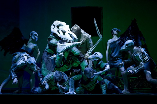 Der dritte Teil der Tetralogie hat durchaus einen Bruch, ähnlich wie die Musik, denn Wagner hatte die Komposition des Siegfried nach dem zweiten Aufzug unterbrochen und zunächst den Tristan und die Meistersinger komponiert. Siegfried ist in dieser Inszenierung ein pubertierender, kraftmeiernder Teenager, der Antworten sucht auf elementare Fragen. Wer war sein Vater, wer seine Mutter? Und was ist mit Mime, den er lange für seinen Vater hält? Die zögerlichen Antworten des Zwerges stoßen ihn in ein emotionales Chaos. Liebe, Geborgenheit, das sind abstrakte Begriffe für ihn, doch genau danach sehnt er sich. Mime kann ihm das nicht geben. Und hier greift Gilmore erstmals ins Geschehen ein. Für sie ist Siegfried Teil der mythischen Wesen, die versteckt in einem gartenähnlichen Feld das Geschehen beobachten und mit ausdrucksstarkem Tanz kommentieren. Sie nehmen direkter als im Rheingold oder in der Walküre am Geschehen teil. Statt aktiver Schmiedeszene Siegfrieds gibt es nur eine imaginäre Andeutung der Kraft, das neu zusammengefügte Schwert Nothung wird ihm von den mythischen Wesen überreicht. Requisiten und Kostüme lassen auf die 1950-er Jahre tippen, ein neuerlicher Zeitsprung im Vergleich zum Rheingold und zur Walküre. Doch die entscheidenden Interaktionen zwischen Siegfried und Mime einerseits und Mime und dem Wanderer in der Wissenswette andererseits bleiben blass und entwickeln nicht die Spannung und Dynamik, die die Musik suggeriert. Fafner ist ebenfalls ein mythisches Wesen, ein Riesentroll, der sich reproduziert hat, und elf kleine Fafners versuchen wie ein triefendes Geschwür Siegfried davon abzuhalten, den Hort für sich zu gewinnen. Die Szene ist großartig grotesk, bunt und schillernd. Als Siegfried Fafner tötet, und mit ihm auch die kleinen Fafners in den letzten Zuckungen liegen, kommt wieder das emotionale Dilemma des tumben Jünglings zum Vorschein. Wie ein kleiner Junge schmiegt er sich an den toten Riesen, wieder eine Vaterfigur, die nicht taugt. In dieser Situation weiß Gilmore Abhilfe zu schaffen. Ein großer, weißer Waldvogel erscheint, mehr Schwan als Vöglein, und nimmt Siegfried mit auf eine emotionale Reise, die ihn zu Brünnhilde führe soll. Das dann noch drei weitere große, weiße Waldvögel auftauchen, passt zu Gilmores Ansatz, den gesungenen Text wörtlich umzusetzen. Der dritte Aufzug gelingt dann fast zur ganz großen Wagner-Oper. Wanderer Wotan ruft Erda hervor, noch einmal will er das Schicksal wenden. Erda, wie schon im Rheingold mit den drei Nornen auftretend, wickelt ihn in seilartiges Tuch, aus dem er sich noch einmal befreien kann für seine letzte Mission, den ungeheuerlichen Jungen aufzuhalten. Die Geschichte ist bekannt.