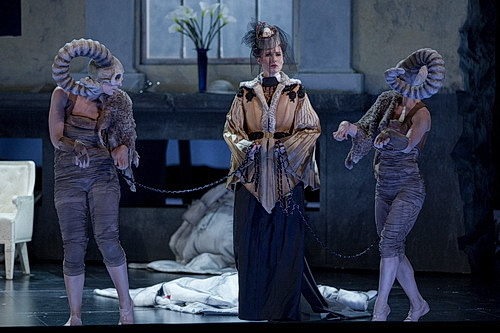 Leider funktioniert das nicht stringent über die ganze Aufführung. Gilmore bleibt ihrem choreografischen Erzählstil, der aus dem Rheingold schon bekannt ist, treu, und wird dadurch auch vorhersehbarer, was der Spannung aber keinen Abbruch tut. So begleiten, großartig dargestellt, Wotans Raben, Frickas Widder und Siegmunds Wölfe den Handlungsstrang. Sie sind stille Beobachter, ohne ins Handlungsgeschehen einzugreifen, und sind doch omnipräsent. Sogar Brünnhildes Pferd Grane wird rührend durch den Tänzer Ziv Frenkel personifiziert, und auch die gefallenen Helden in Walhall dürfen mitspielen, auch wenn deren Choreografie nicht immer nachvollziehbar ist. Angesiedelt von der Ausstattung und den Kostümen spielt die Walküre zum Ende des 19. Jahrhunderts, konzeptionell also nach Wagners Tod. Interessant ist die Figur Frickas, die optisch einer jungen Cosima von Bülow ähnelt, die ihren Göttergatten klar in die Knie zwingt. Ob die Ähnlichkeit gewollt ist oder Zufall, dramaturgisch macht es durchaus Sinn. Siegmund und Sieglinde, das liebende Geschwisterpaar, bleiben spielerisch eher blass, weil Gilmore ihre Interaktion doch sehr statisch anlegt. Überhaupt ist wenig Bewegung im Spiel, es ist mehr die Kraft des Ausdruckes, des Blickes, der kleinen Gesten, die berühren.