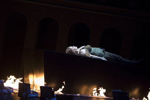 Dass Siegmund am Schluss des zweiten Aufzuges von Hunding erschossen wird, steht zwar nicht in Wagners Regieanweisung, passt aber durchaus in das Gesamtkonzept einer bildreichen Sprache. Ansonsten ist Gilmore eine enge Werktreue zu attestieren, zum finalen Feuerzauber mit ordentlicher Pyrotechnik darf Loge höchst persönlich erscheinen und den Feuerkreis um Brünnhildes Felsen ziehen. Carl Friedrich Oberle hat wieder die Bühnenbilder geschaffen. Im ersten Aufzug ähnelt Hundings Hütte einem offenen Betonbunker mit Stacheldrahtverhau auf dem Dach, dessen Rückwand sich passend zu Siegmunds Winterstürme wichen dem Wonnemond … öffnet. Im zweiten Aufzug setzt er sein Walhalla-Bild aus dem Rheingold fort, doch wirkt die Götterbehausung schon baufällig, ja ruinös. Im zweiten Bild des Aufzuges bleiben nur die Seitenwände stehen, und das Geschwisterpaar erscheint aus einem zerklüfteten Hintergrund. Im dritten Aufzug dominiert ein zentraler Stahlblock, der Walkürenfelsen, um den mehr als 200 Paar weiße Stiefel als Symbol der gefallenen Helden stehen, die nach Walhall durften. Das erinnert fatal an amerikanische Heldendenkmäler, wo Veteranen ihre Stiefel zur Erinnerung an ihre gefallenen Kameraden drapieren. Ein schon fast einstürzender Bau mit großen Bogenfenstern scheint Walhalls Rückfront zu sein, hier dürfen sich am Schluss die Walküren aufreihen. Die Kostüme von Nicola Reichert sind nicht spektakulär, eher bieder, ganz im Stile des ausklingenden 19. Jahrhundert. Die Walküren in ihrem Amazonenoutfit sind dagegen ein echter Hingucker. Erwähnenswert auch wieder die Lichtregie von Michael Röger, die auf den Punkt gesetzt stimmungsvoll die Musik untermalt.