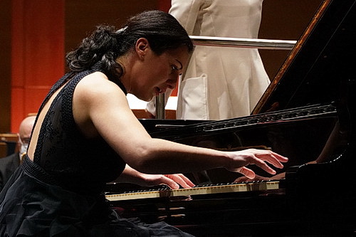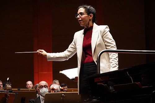 Avni betritt die Bühne und versprüht vom ersten Moment an eine Energie, die Funken schlagen möchte. Ihrer kurzen Ansprache folgt Arnold Schönbergs Fanfare for a Bowl Concert aus dem Jahr 1945. Eine beliebte Eröffnung, denn man gibt sich den Anstrich „moderner“ Klassik und läuft nicht Gefahr, das Publikum zu strapazieren. Der Programmpunkt dauert nur ein paar Minuten. Aber das steht ja nicht auf dem Abendzettel. Danach wird es ernst. Oder eben auch nicht. Dmitri Schostakowitschs Klavierkonzert Nr. 1 ist ein Doppelkonzert für Klavier, Trompete und Streichorchester aus dem Jahr 1933, das neben klassischen Elementen auch viel Humor enthält. Für den Abend konnten Tamar Beraia als Pianistin und Tamás Pálfalvi an der Trompete gewonnen werden. Welch ein Erlebnis! Die Notenblätter sucht man bei Beraia vergebens, wenn sie ihrer Virtuosität freien Lauf lässt. Bei der Uraufführung zur Spielzeiteröffnung des Leningrader Philharmonischen Orchesters saß Schostakowitsch selbst am Flügel. Aber ganz ehrlich: An diesem Abend in Leverkusen kann es keinen Menschen gegeben haben, der glaubt, dass er es besser gemacht hat. Pálfalvi scheint ein wenig gelangweilt, aber das täuscht. Er ist bestens vor der Zeit vorbereitet, bringt seine Einsätze präzise und auf den Punkt. Der zweite Höhepunkt des Abends ist formvollendet gelungen. Avni wirkt gespannt bis unter die Haarspitzen. Hier darf noch ein wenig Gelassenheit und Vertrauen in die Solisten einkehren.