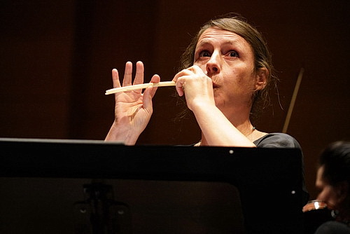 Stein­zeit­flöten? Ja, gibt es tatsächlich. Und nachdem Poten­gowski ihre Funktio­na­lität am Beispiel des O Ecclesia von Hildegard von Bingen gezeigt hat, erzählt sie auch einiges über die Fundorte und Beschaf­fen­heiten der Knochen­flöten. Von der Steinzeit geht es aller­dings gleich mal in die Gegenwart. Dorothée Hahne hat für Oberlinger das Stück commen­tarii III für Block­flöte und Elektronik geschrieben. Ein Stück, bei dem es der Kompo­nistin ganz offenbar darum ging, Oberlinger alles an Virtuo­sität abzuver­langen, was niemandem anderen gelingt. Für die Block­flö­tistin anscheinend ein Spaziergang, immerhin mit Kopfhörer auf den Ohren.
