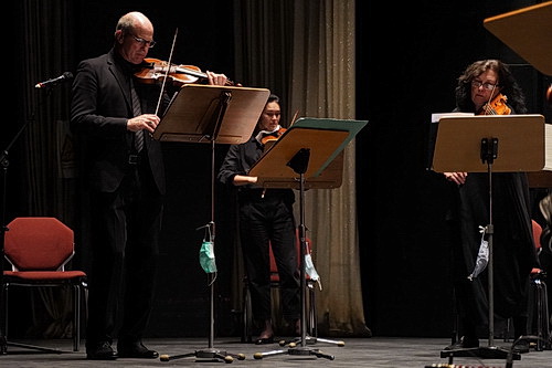 Wobei der Große Saal dieser Tage relativ zu betrachten ist. Er wird einfach stärker belegt, weil in anderen Räumen die Abstands­regeln nicht so leicht einzu­halten sind. Trotzdem ist eine gehörige Besucher­schar zusam­men­ge­kommen, die auch vor einem Bravo-Ruf nicht zurück­schreckt und sich im Applaus überschlägt. Hier hat an diesem Abend ein Glanz­licht der Musik statt­ge­funden. Und vielleicht ist das der positive Aspekt der Corona-Krise, dass solche Programme häufiger statt­finden, die abseits des Reper­toires Neues und Ungewöhn­liches wagen. Zu begrüßen wäre es. Und so darf man gespannt sein auf das nächste Konzert. Das Neue-Musik-Ensemble E‑Mex wird am Sonntag ein Gesprächs­konzert in Lever­kusen aufführen, das sich mit Original und Bearbeitung beschäftigt. Auch hier steht eine Urauf­führung auf dem Zettel. Mitten im Niemandsland zwischen Düsseldorf und Köln. Großartig.