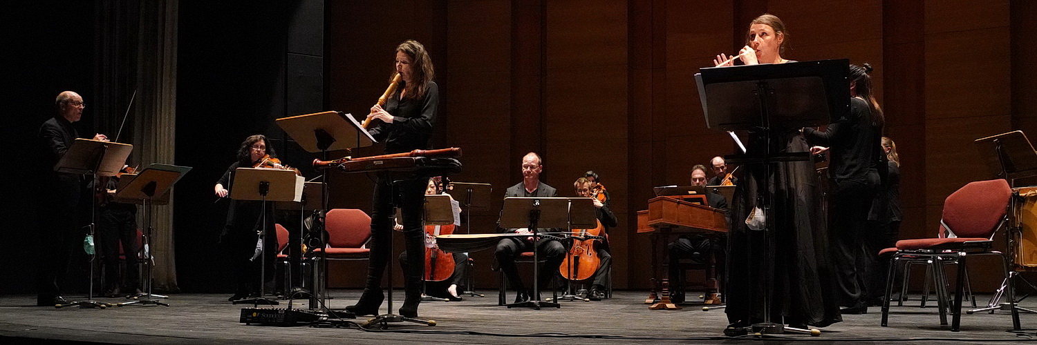 Gerade für Konzert­gänger, die das Ungewöhn­liche suchen, lohnt aber oft ein Blick in die Angebote von Kultur­stätten in kleineren Städten. Vor allem in Zeiten, in denen Konzerte immer noch eher zur Mangelware gehören, ergreifen Künstler auch gerne die Gelegenheit, auf „kleineren“ Bühnen aufzu­treten. Das Forum Lever­kusen gehört zu den Bühnen, die sich längst einen Namen für ungewöhn­liche und quali­tativ höchst­wertige Auffüh­rungen gemacht haben. Ob im Bereich Musik­theater, Jazz oder auch Comedy, na gut, lohnt immer ein Blick in das Programm der Spiel­stätte, die vom Engagement ihrer Drama­turgen lebt. Und da kann man plötzlich in der Konzert­reihe Grenz­gänger einen Auftritt entdecken, der einen verwundert aufhorchen lässt. Dorothee Oberlinger gibt mit L’arte del mondo und Freunden ein Konzert unter dem Titel Eternal Breath – Ein Atem durch die Zeit. Ein Mini-Plakat am Eingang des Foyers im Forum Lever­kusen weist darauf hin, und vermutlich sieht es in der Stadt nicht anders aus. Oberlinger gilt als „Königin der Block­flöte“, so ist sie tatsächlich schon bezeichnet worden, lehrt Alte Musik in Salzburg und tritt auch auf Bühnen auf, auf denen ihre wechselnden Ensembles gerade noch Platz haben. Dabei ist sie durchaus von einem gewissen Sendungs­be­wusstsein beseelt, was die Block­flöte angeht. Rund 100 nennt sie ihr eigen. Und die jeweils passenden bringt sie mit, um ihre oft außer­ge­wöhn­lichen Programme zu präsentieren.