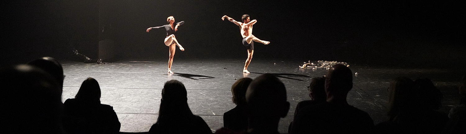 Rechts im Hintergrund steht eine schwarze Box. Im Mittelpunkt gibt es eine schwarze Folie, unter der es nach dem Auftritt einer nicht erkennbaren Person viel Bewegung gibt. Die Geschichte, die sich Harriague ausgedacht hat, scheint schnell erzählt. Unter einer Schicht, die sich auf der Erdkruste aus schwarzem Plastik aufgebaut hat, kriecht ein Mensch. Er zieht die Kruste von der Erde und wendet sich der Box zu, aus der er Fossiles zieht. Ein paar Steinbrocken und schließlich ein Skelett. Während die Skelette in den Schulklassen Frankreichs Oscar heißen, haben die Tänzer ihr Skelett Max genannt. Und Max wird der Tänzerin noch ganz schön zu schaffen machen. Oscar Pascual ist also als Tänzer inzwischen in die urzeitliche Box gekrochen und hat dort ein Skelett ausgegraben. Mit dem Skelett taucht auch Lara Ivančič auf. Ivančič bekommt den Schädel in die Hand – und scheitert daran. Der Tanz mit einem Gegenstand gehört wohl zum Schwierigsten, was ein Tänzer bewältigen kann. Und Harriague hat die Hürden hier besonders hochgelegt. Da kommt Ivančič nicht mit. Theatralik, Eleganz, Geschmeidigkeit und vermutlich auch einfach Lebenserfahrung fehlen, um aus dem Tanz ein rundes Erlebnis zu gestalten. Ihre Chance kommt, als sie Pascual, der sich inzwischen in die Box zurückgezogen hat, wiederbeleben muss. Das gelingt ihr wunderbar, und der anschließende Pas de deux gerät zum Höhepunkt des Abends. Der Choreograf hat hier eine schöne Bewegungssprache gefunden, die sich im Spannungsfeld von Ballett-Kunst, Einfallsreichtum und beinahe schon Humor bewegt.